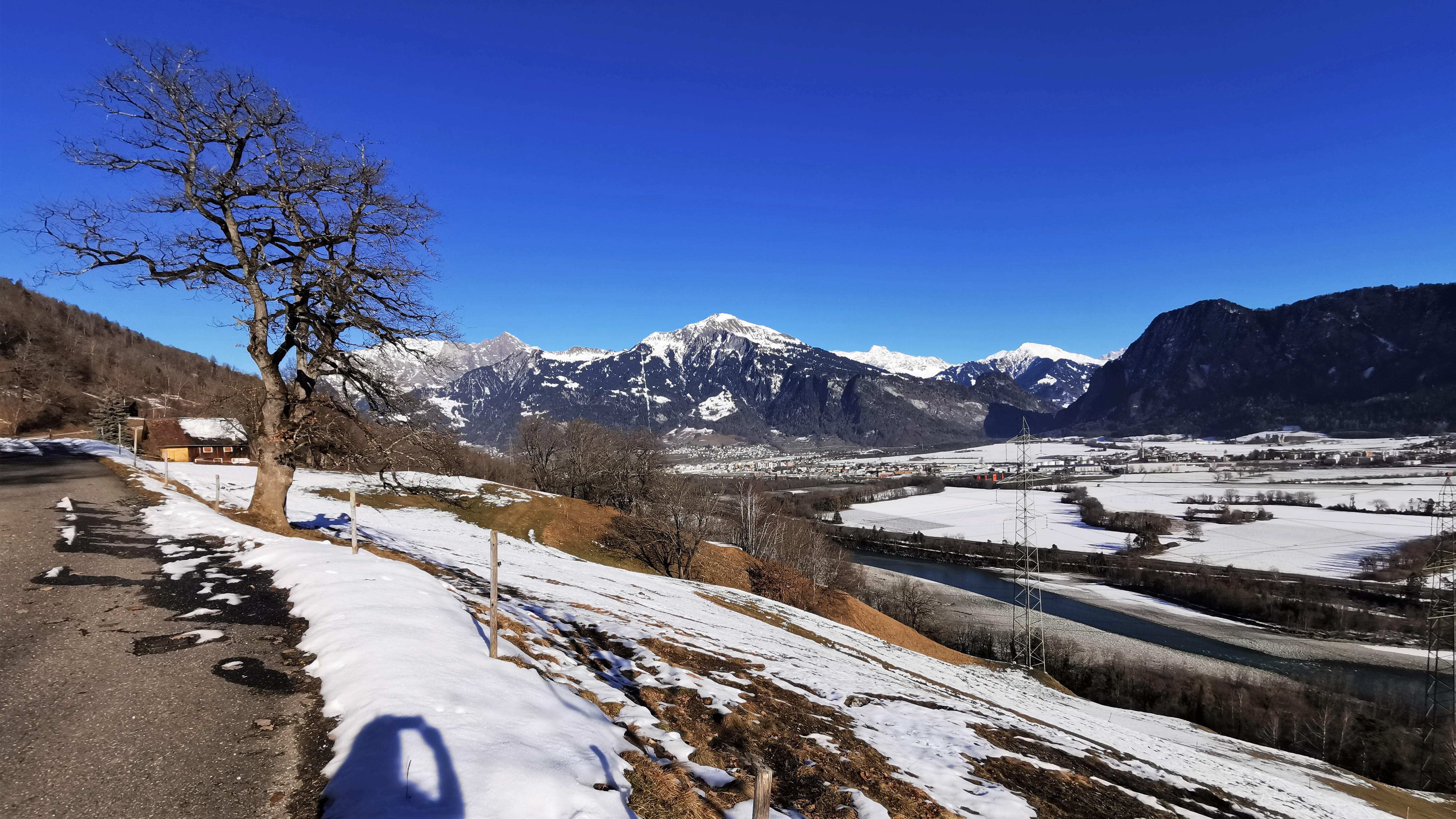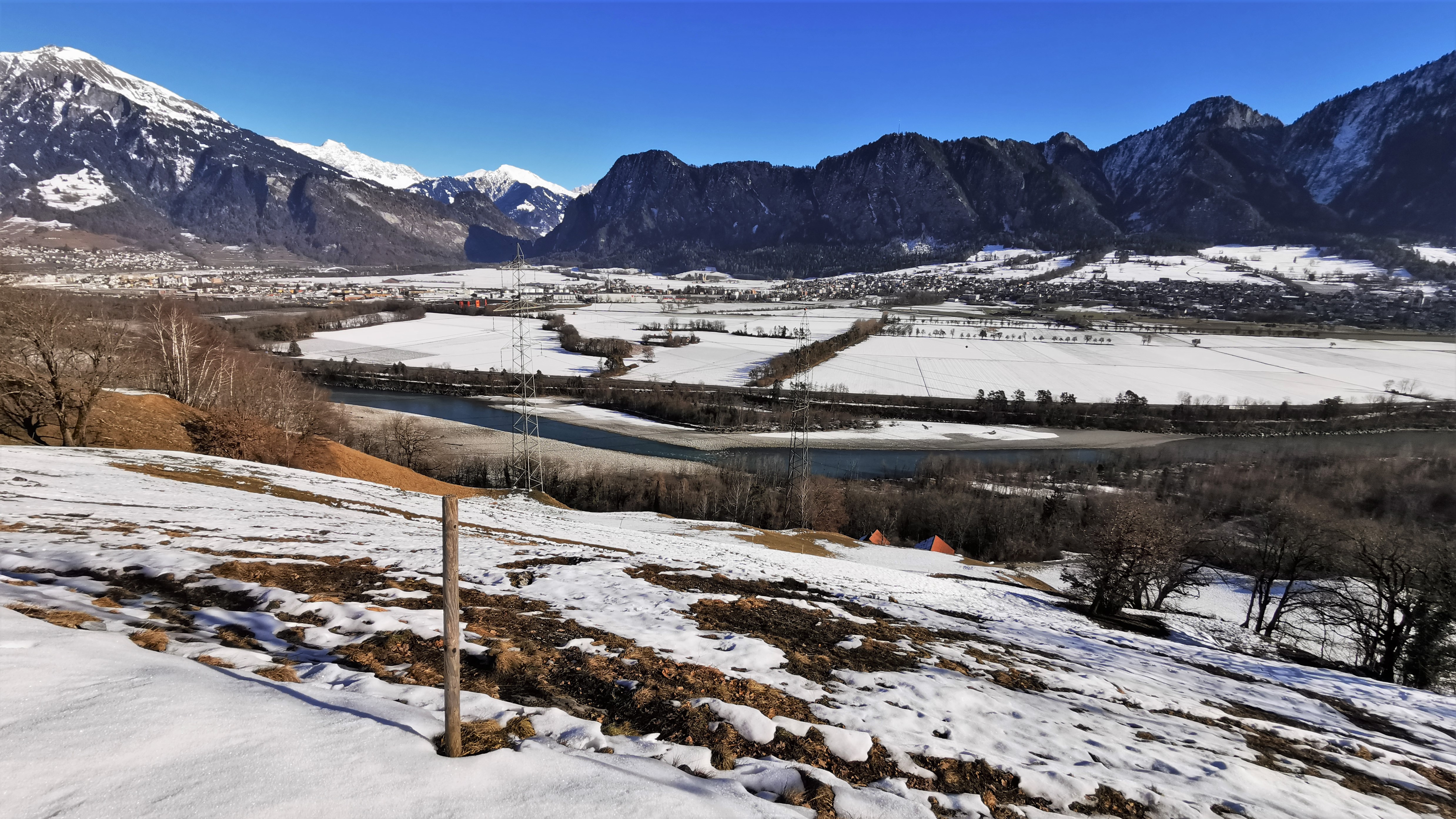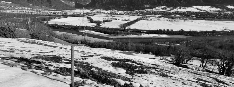Blick über die Wiesen der Frättis hinab zum Rhein. Ganz unten die Dachfirste eines Gehöftes in Friewis. In der Bildmitte gegenüber die Ortschaft Igis, ganz…