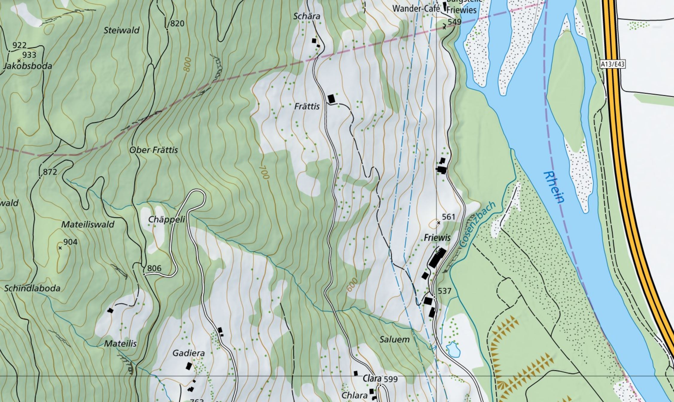 Kartenausschnitt mit der Lage der Frättis oberhalb (westl.) des Rheins.