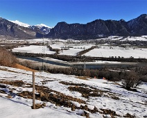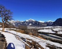 Blick nach Nordosten von der Strasse (auf ca. 644 m Höhe) zur Frättis-Alpe (von der Clara kommend) über das Rheintal hinweg zum Vilan (2.375 m) im Rätikon.