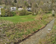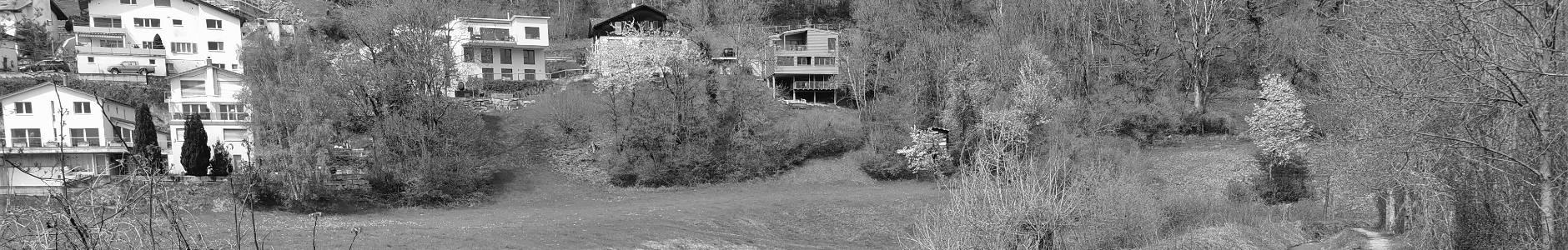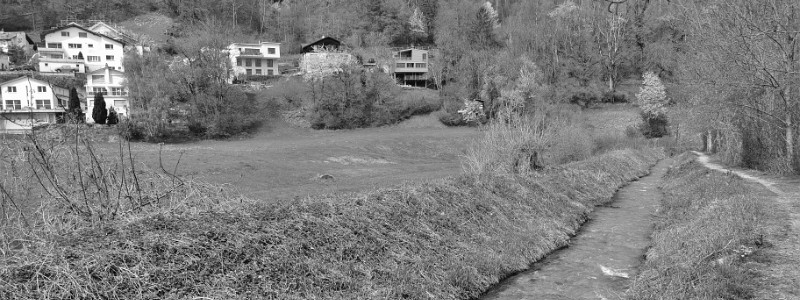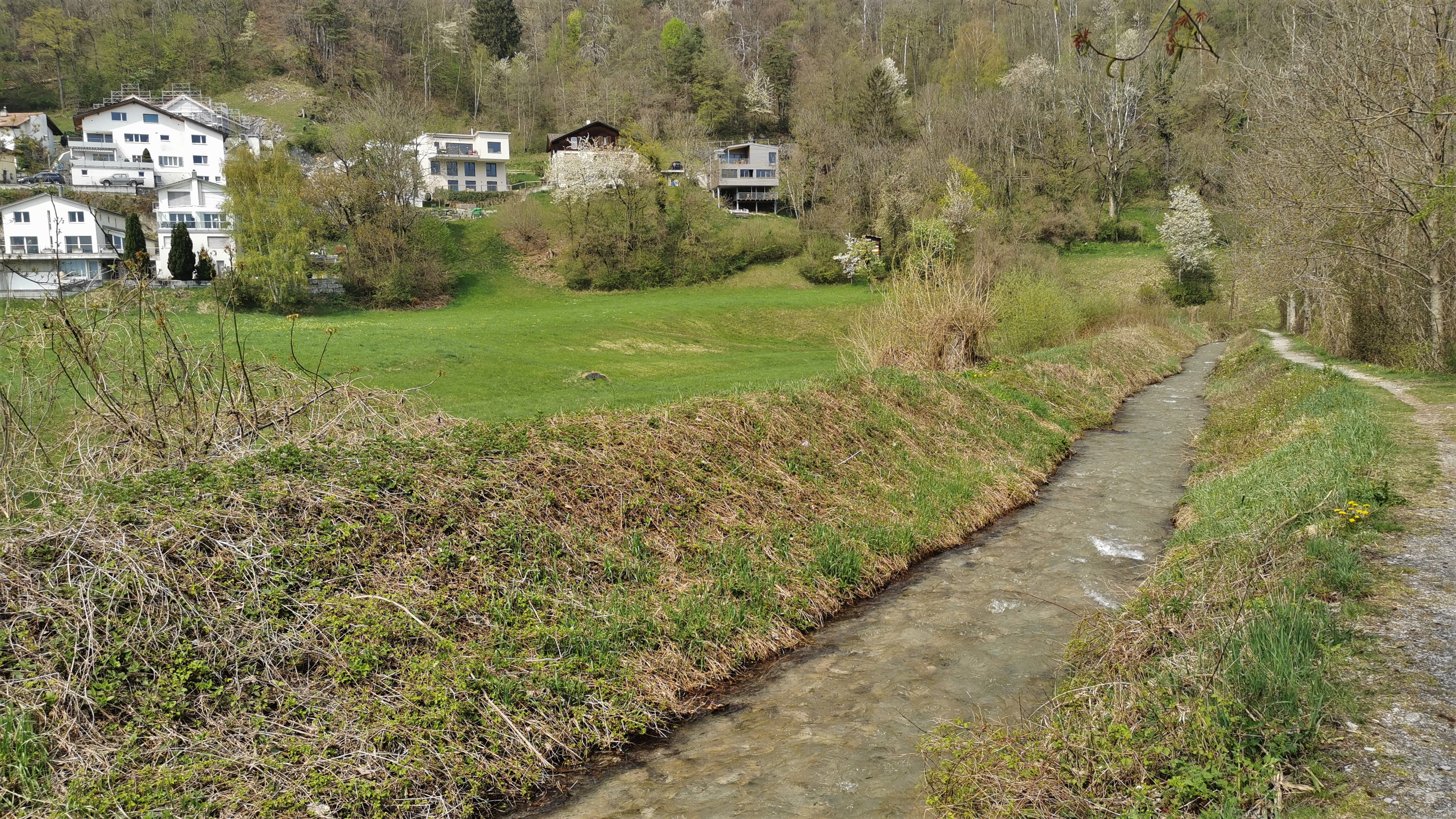 Blick vom Damm am Rüfiweg über den Cosenzbach hinweg ins Flumisloch. Dahinter die Wohnhäuser in Flumis (Claraweg).
