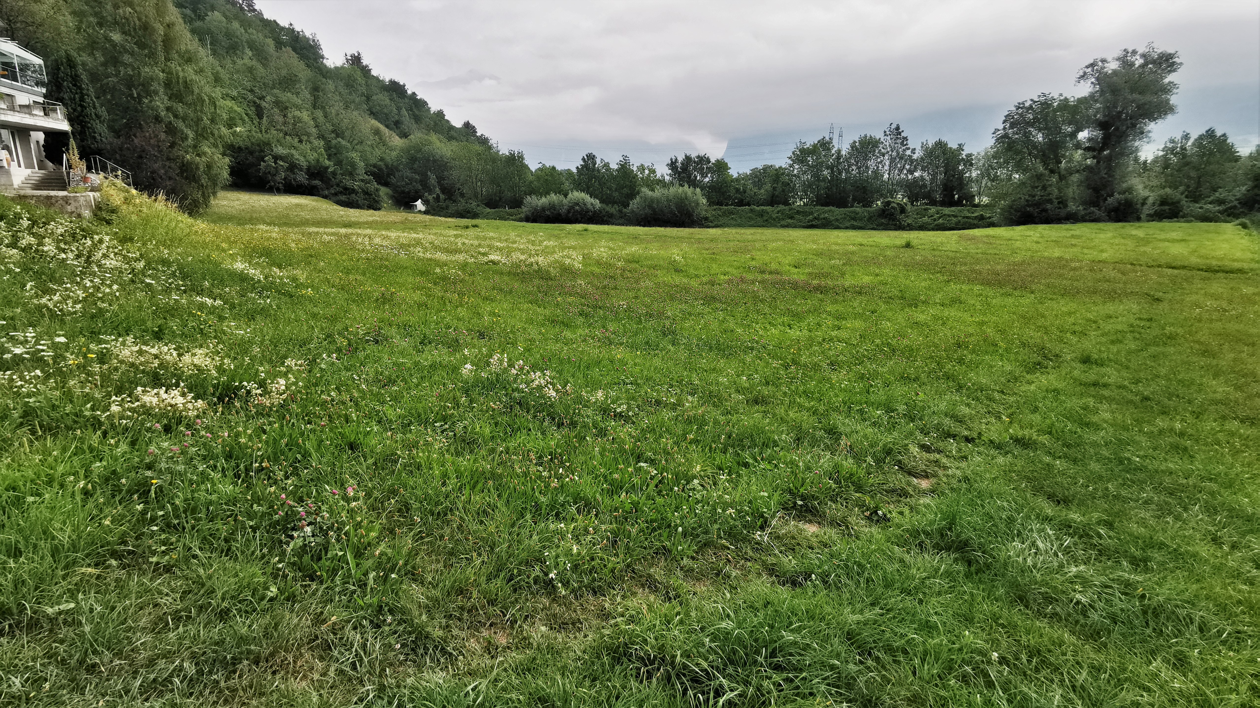 Blick von Flumis über die Wiese des Flumislochs nach Nordosten. Im Hintergrund der Damm des Cosenzbaches.
