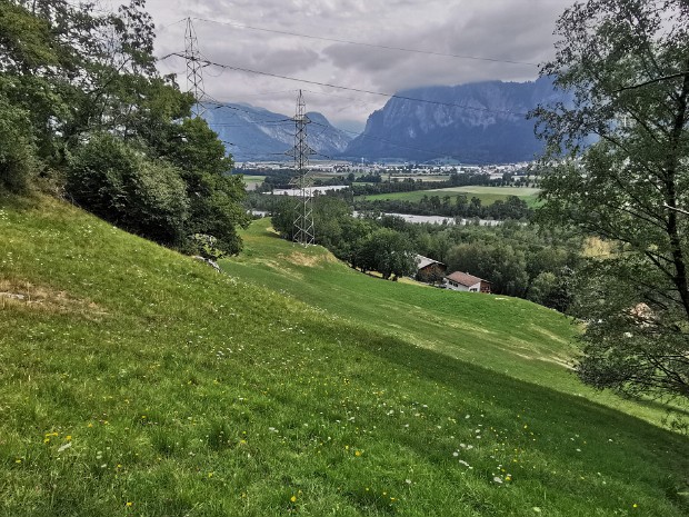 Felder und Weiden (auf ca. 540 m Höhe) zwischen Industriegebiet Untervaz und dem Burgherteli nahe dem Rhein. Im Westen wird die Ebene durch die Steilhänge des…