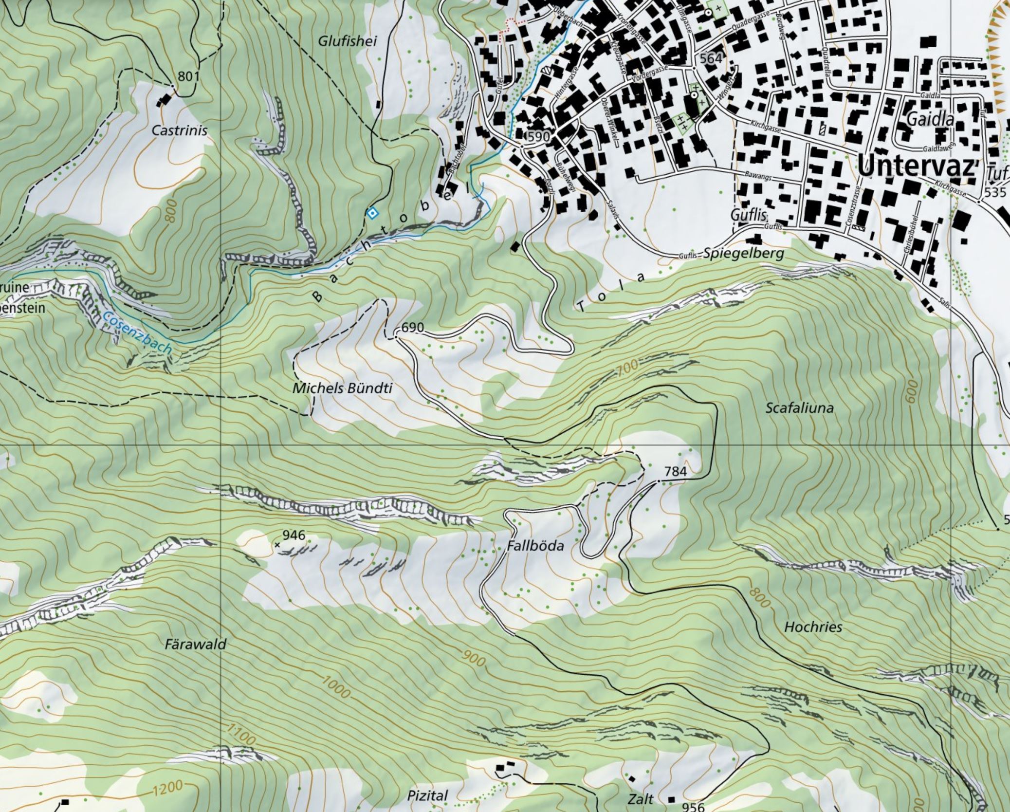 Blick aus dem oberen Bereich des Fallbodens (auf ca. 861 m Höhe) nach Nordosten, in der Ferne das in seinen Gipfeln noch winterliches Rätikon. Dazwischen das…