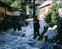 Rekruten stochern im Soldammwasser (im Töbeli), damit das Geschiebe eher mitlaufen sollte.
