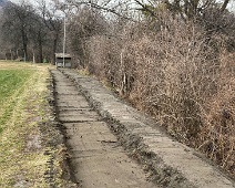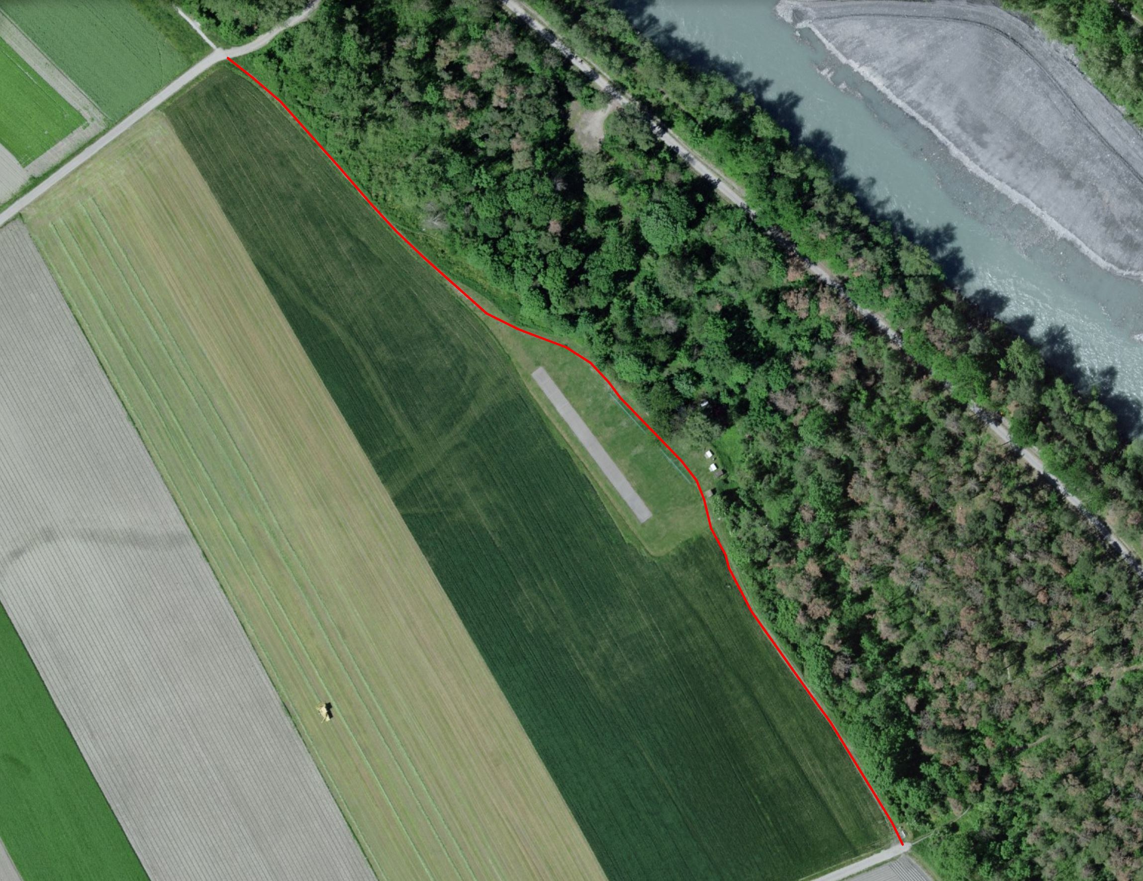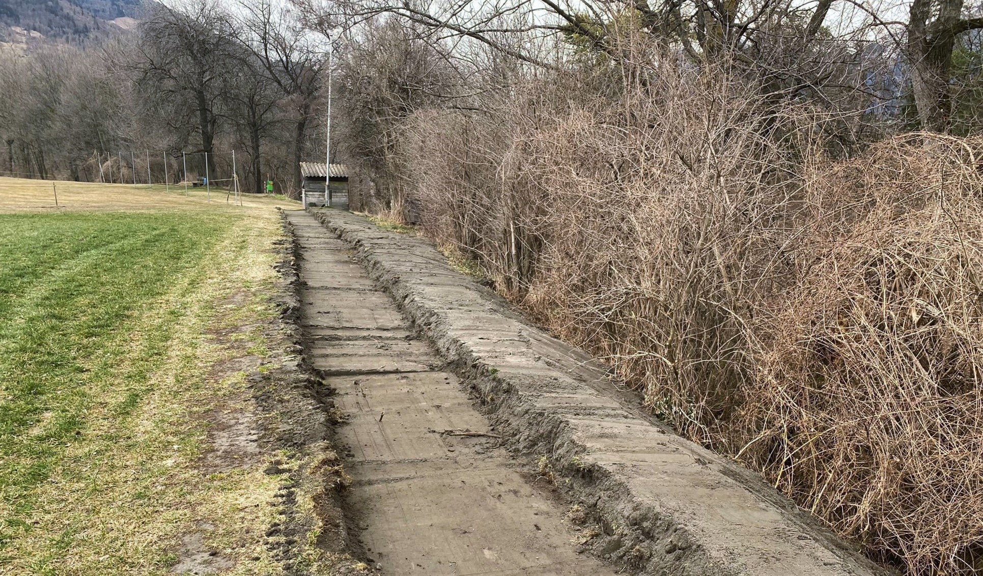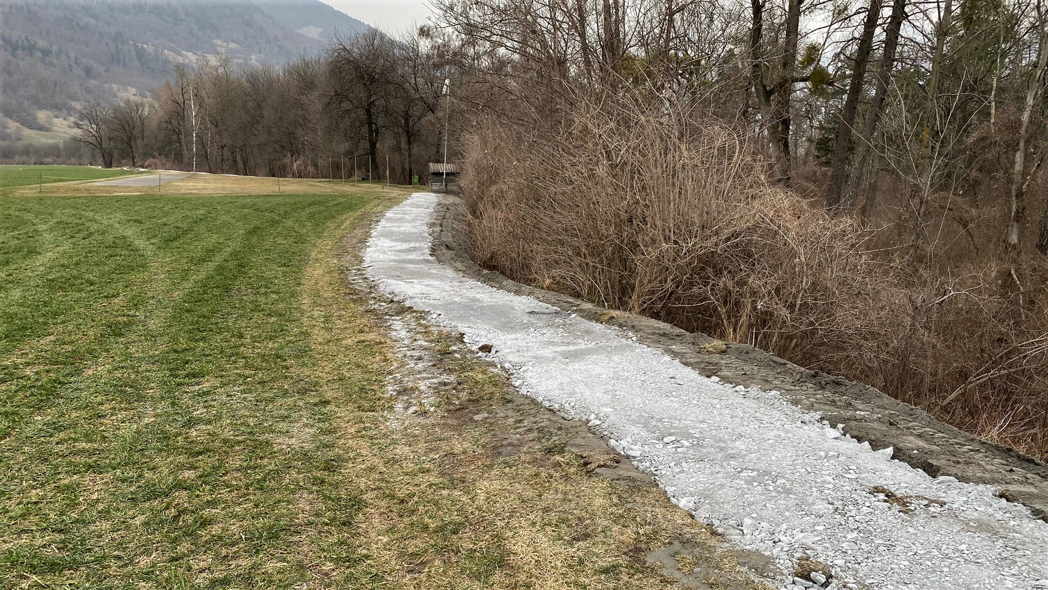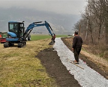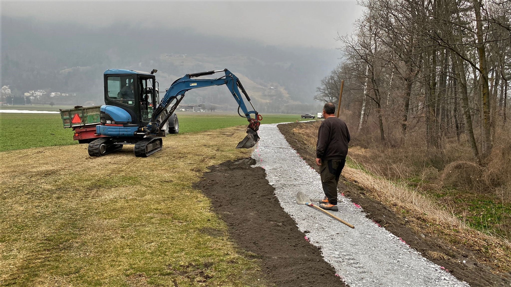 Blick auf das ausgehobene und geglättete Trasse des neuen Fussweges im Fressguet (Schinderhütta), nahe dem Modell-Flugplatz. Rechts der Auwald.