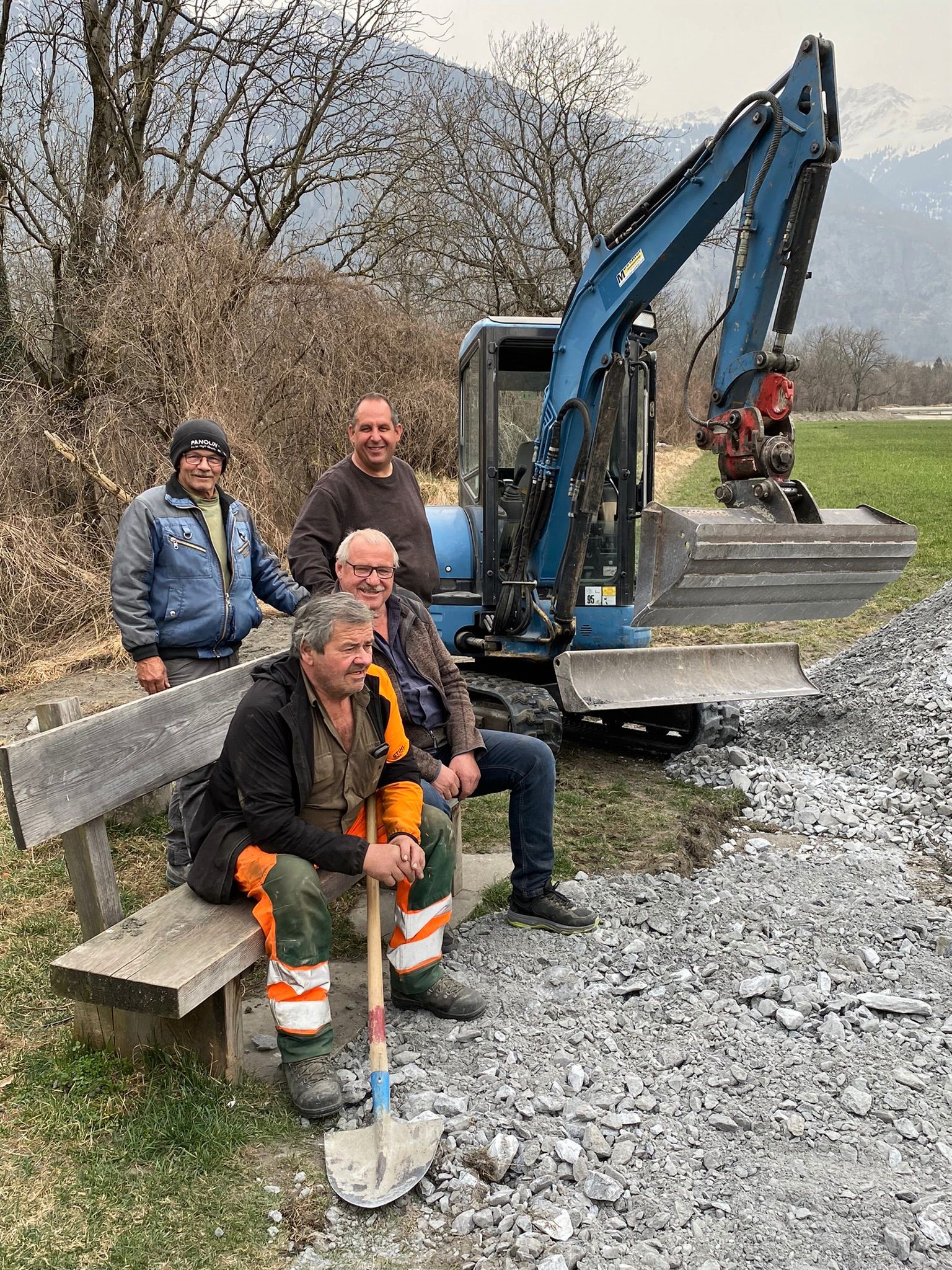Die 'Crew' zur Erstellung des neuen Fussweges am Fressguet (Schinderhütta) mit Arbeitsgerät. Rechts sitzend Markus Bürkli, Vorstand des Burgenvereins, auf…