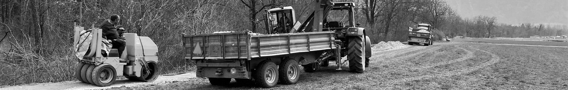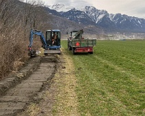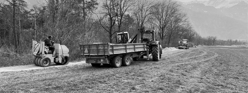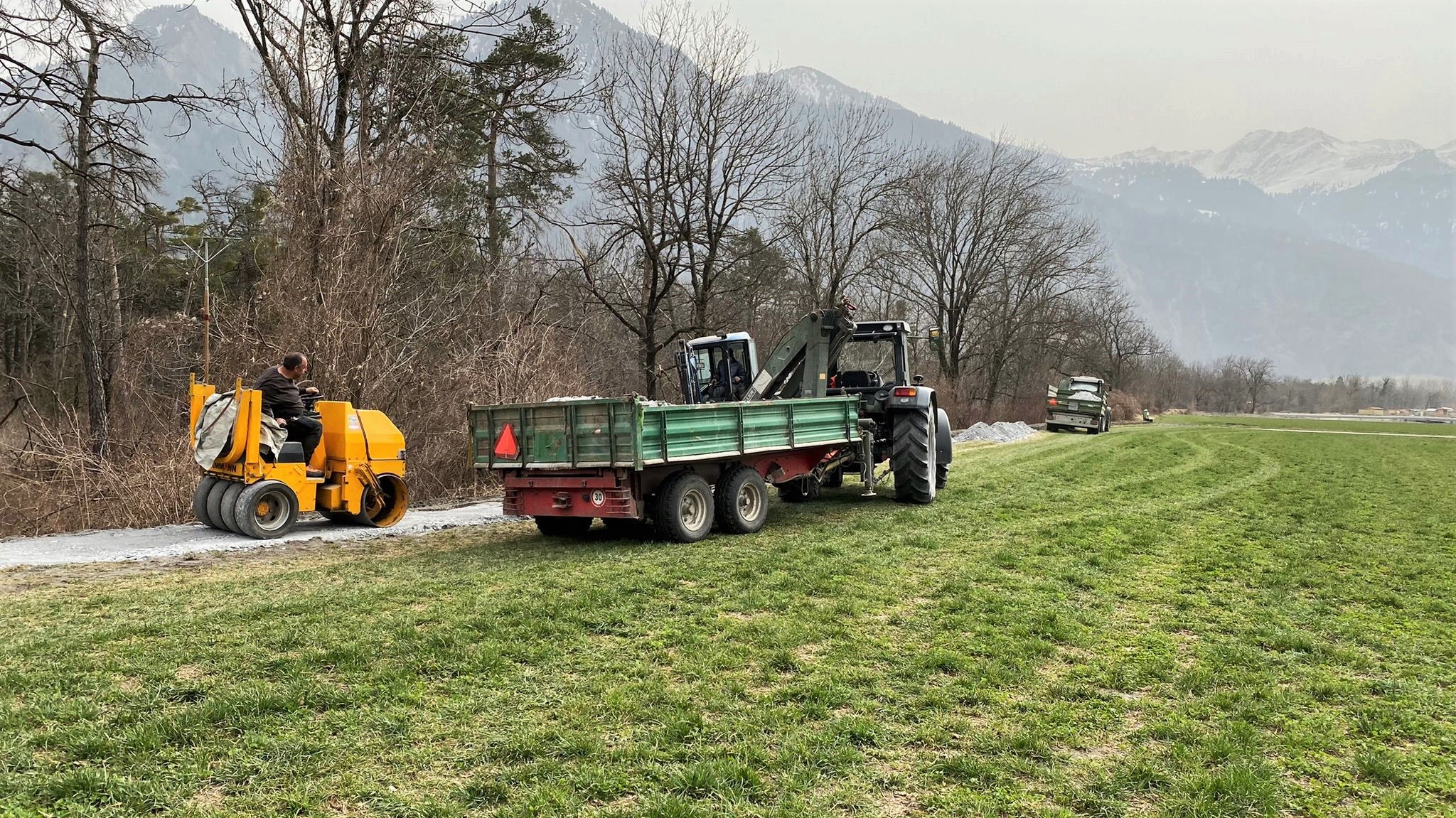 Vorbereitung des Trasses, Abtragung der Grasnarbe. Blick nach Südosten, im Hintergrund Hochwang, rechts die Felder im Fressguet (Schinderhütta) nahe dem…