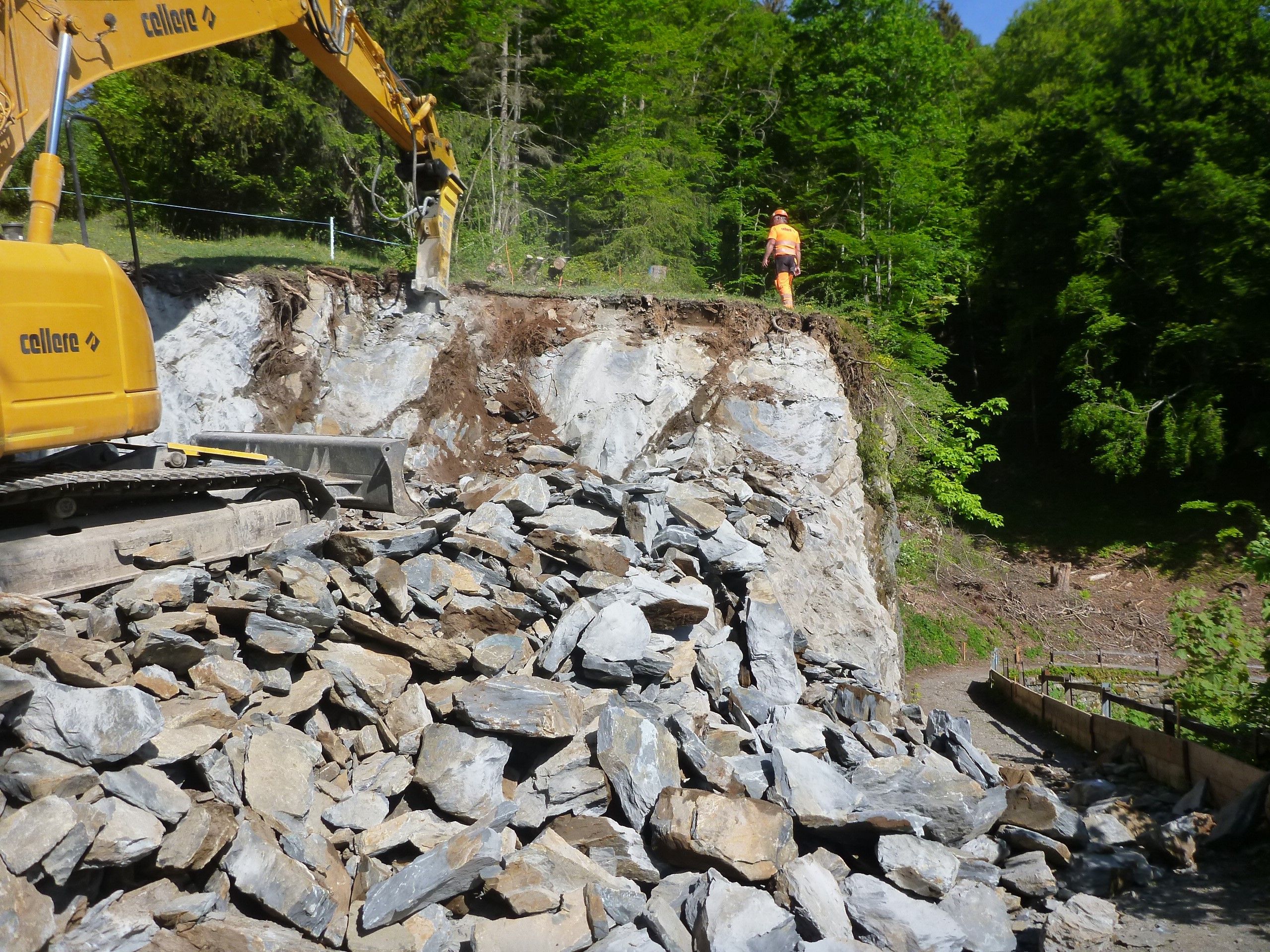 Abbaggern eines Felsmassivs zur Verbreiterung der Alpstrassen-Trasse zwischen Lat und Pramanengel. Gut zu erkennen in welcher Breite der Fels abgetragen wurde.