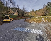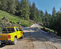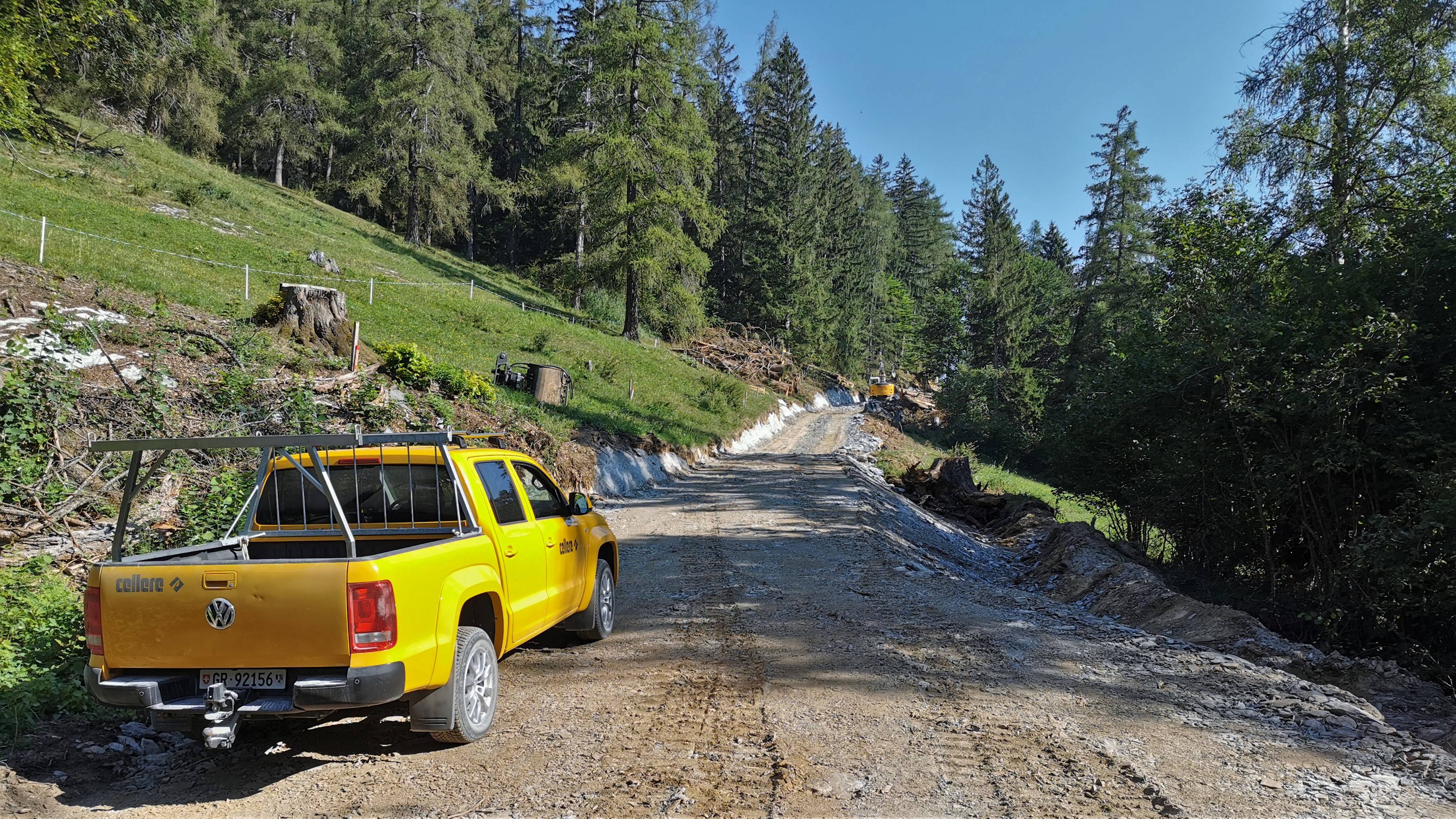 Erweiterte Alpstrasse vom Lat in Richtung Pramanengel (auf ca. 915 m Höhe) mit diversen Baumaschinen. Blick nach Norden.