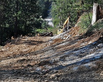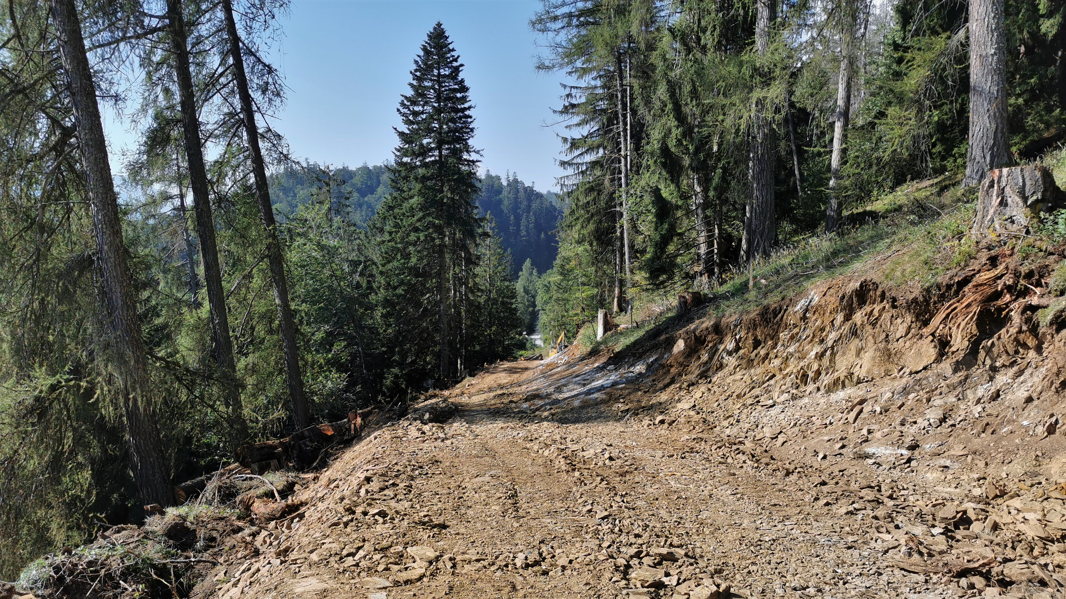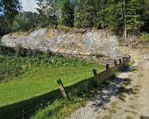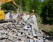 Blick vom Valdrugs entlang der vorplanierten Trasse in Richtung Südwesten. Die hangseitig noch vorhandenen Felsplatten werden mit einem Meissel per Bagger…