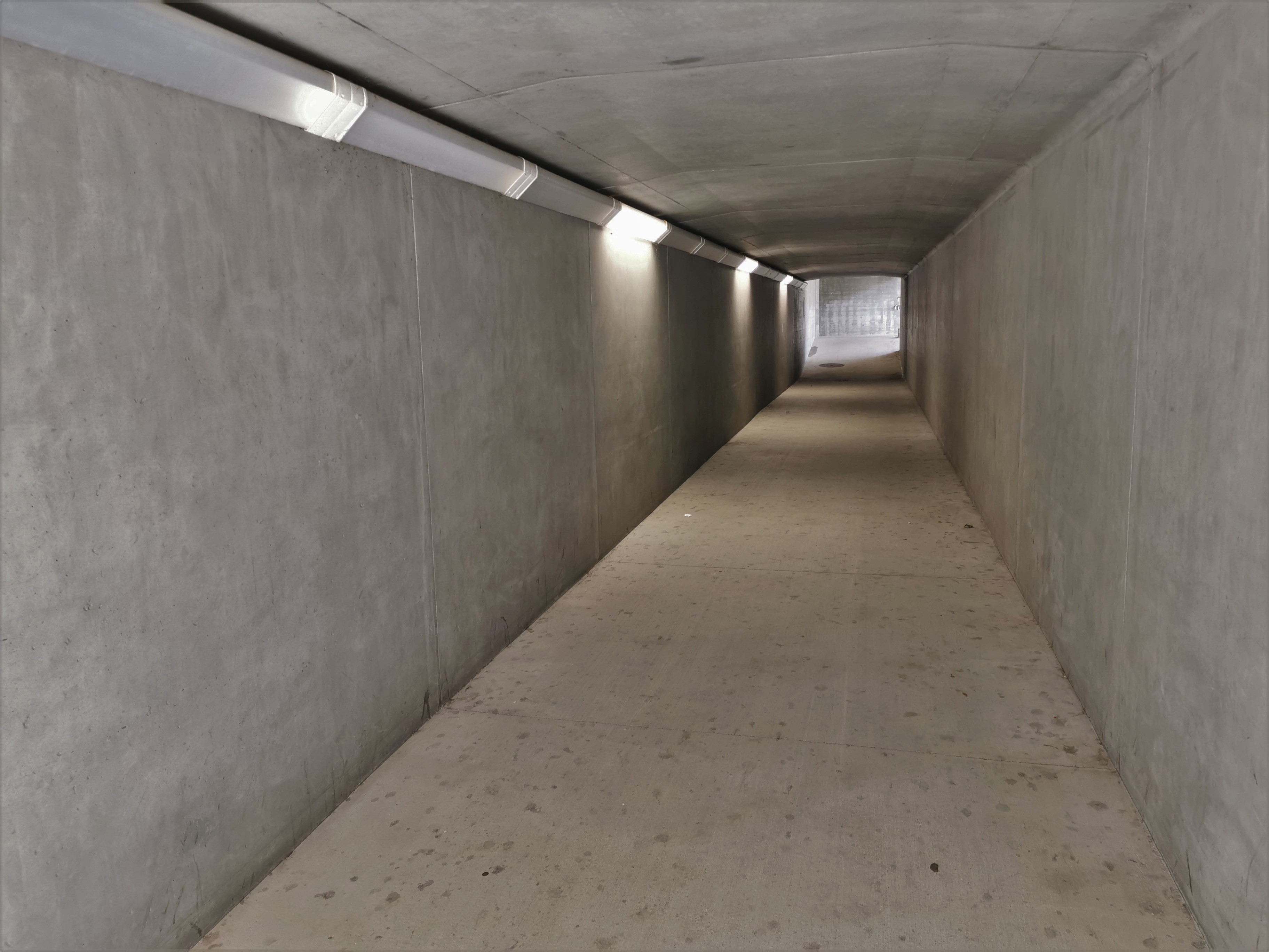 Gleis 5 vom Bahnhof Untervaz (auf dessen östl. Seite) mit Abgang zur Fussgängerunterführung, Blick nach Süden, links die Oberaustrasse (Trimmis), rechts im…