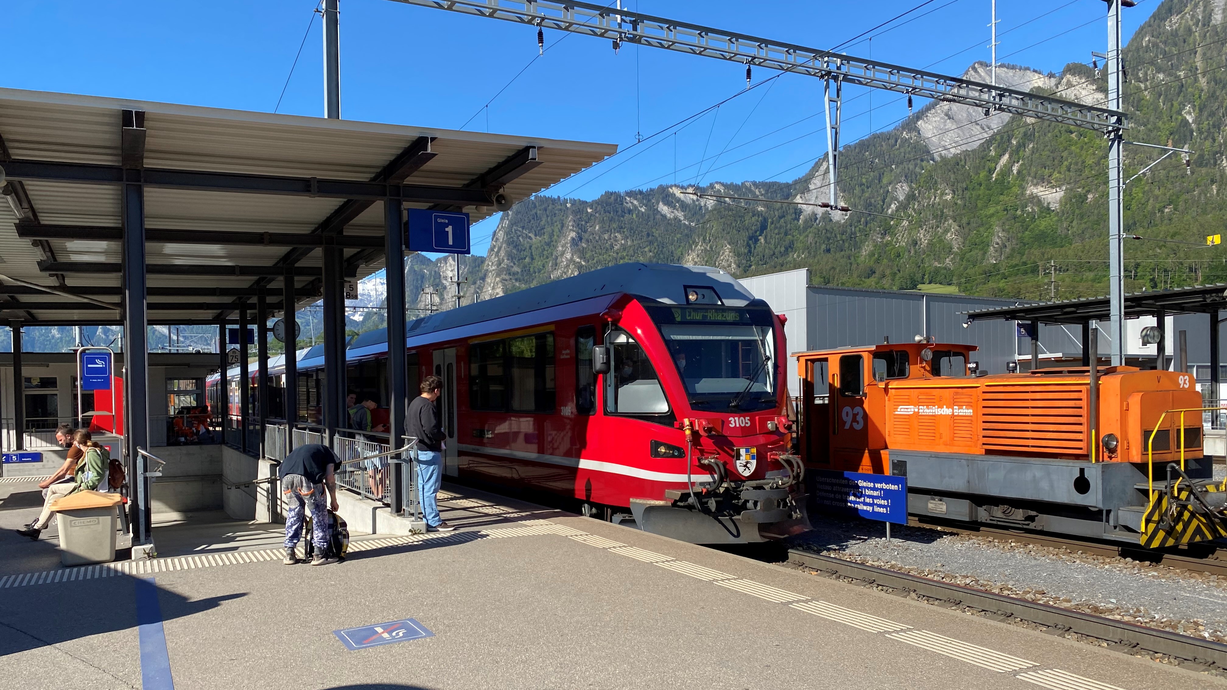 Einfahrt eines RhB-Triebzuges in den Bahnhof Untervaz, von Landquart kommend, rechts daneben eine Rangierlok der RhB, links die Bahnsteig-Überdachung mit dem…
