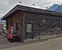 Güterhalle des Bahnhof Untervaz am Gleis 1, Blick vom Südwesten, links im Hintergrund ein Teil der Strassenüberführung über Geleise und Autobahn