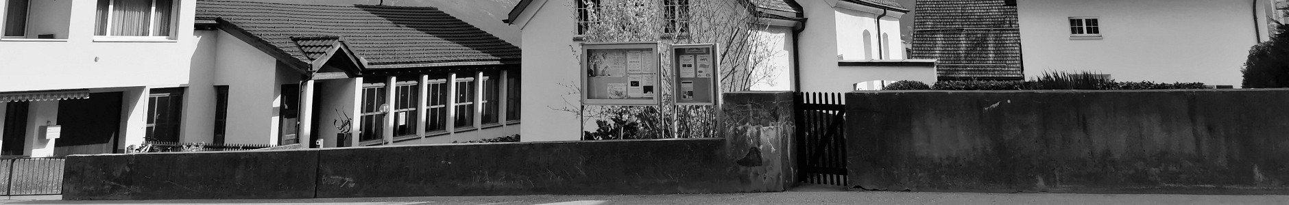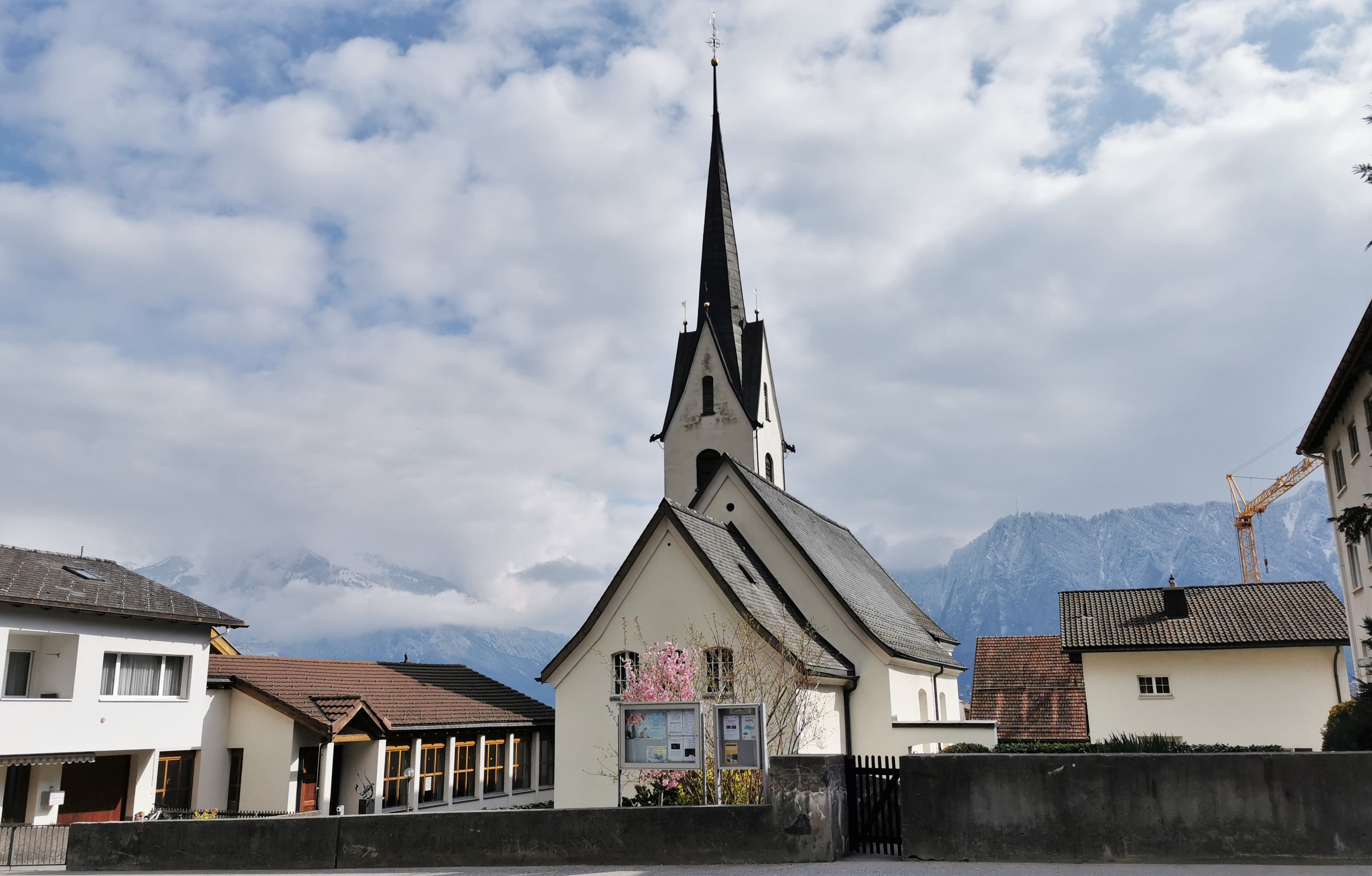 Blick auf Gemeindeverwaltung Untervaz (rechts) und die evang. Kirche (links) an der Ulmgasse