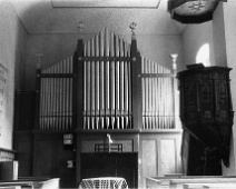 Blick im Kircheninnenraum auf die ehem. Orgel der evanglischen Kirche, Aufnahme-Datum unbekannt.