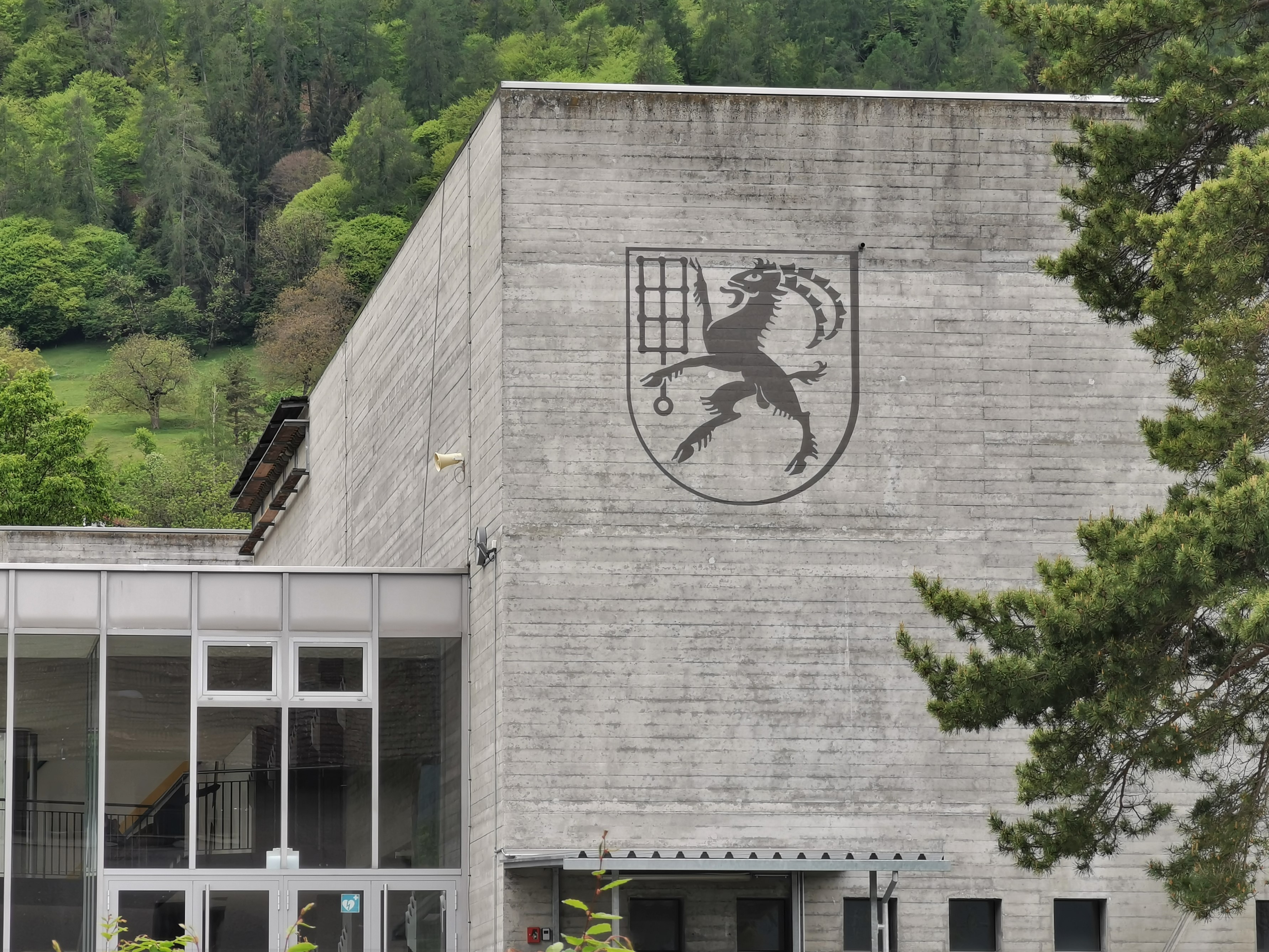 Wappen der Gemeinde Untervaz an der Nordostwand der Mehrzweckhalle auf dem Gelände der Schule.
