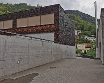 Architektonische Details an der Nordwand der Mehrzweckhalle auf dem Gelände der Schule Untervaz. Bemerkenswert die diagonal gezogenen Sicken in der Betonwand…