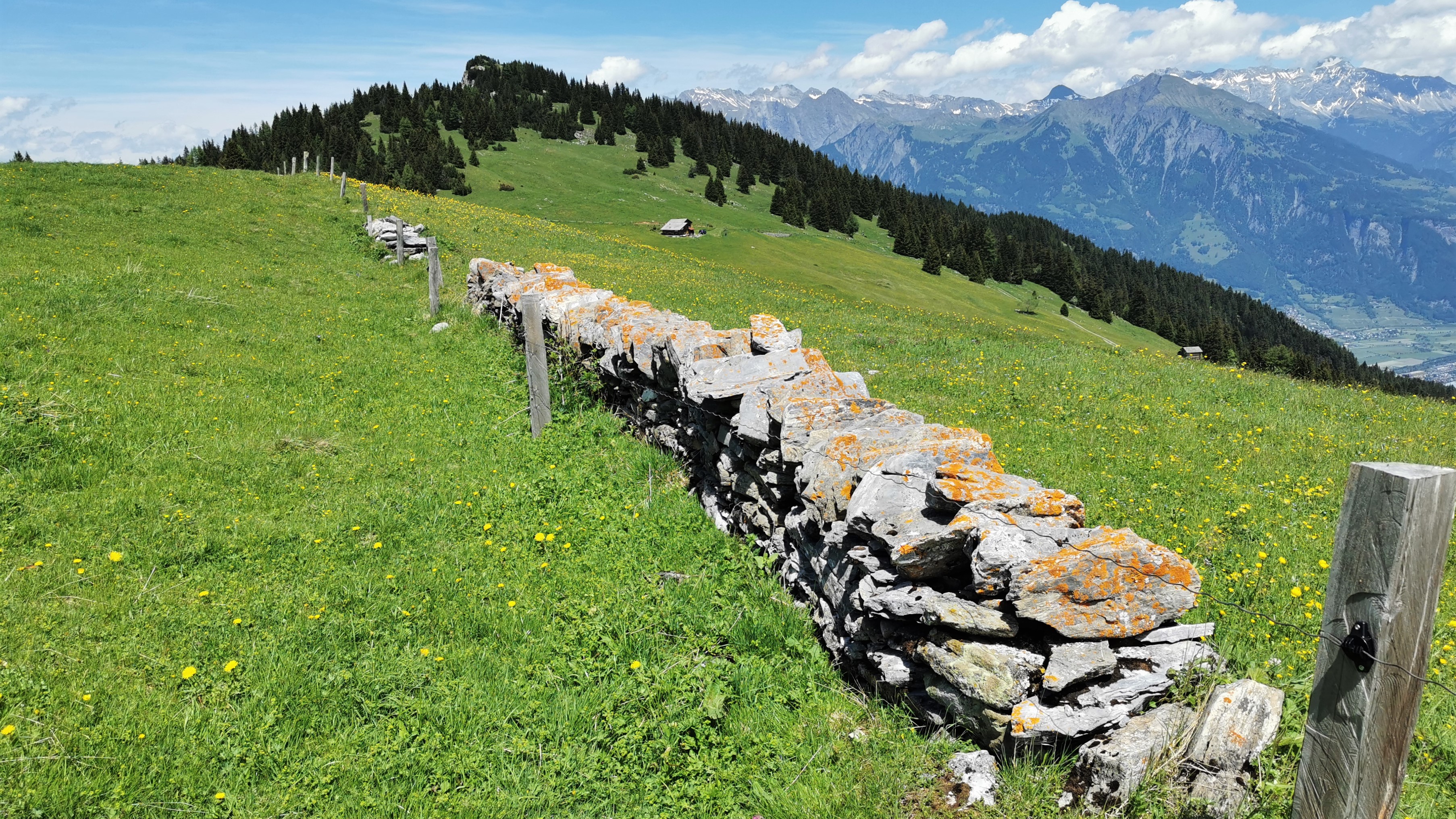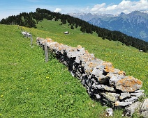 Reste einer Natursteinmauer am Ostrand der Salaz (auf ca. 1.774 m) zum Viöleler hin. Im Hintergrund links der bewaldete Gipfel des Zweienspitz (1.858 m), rechts…