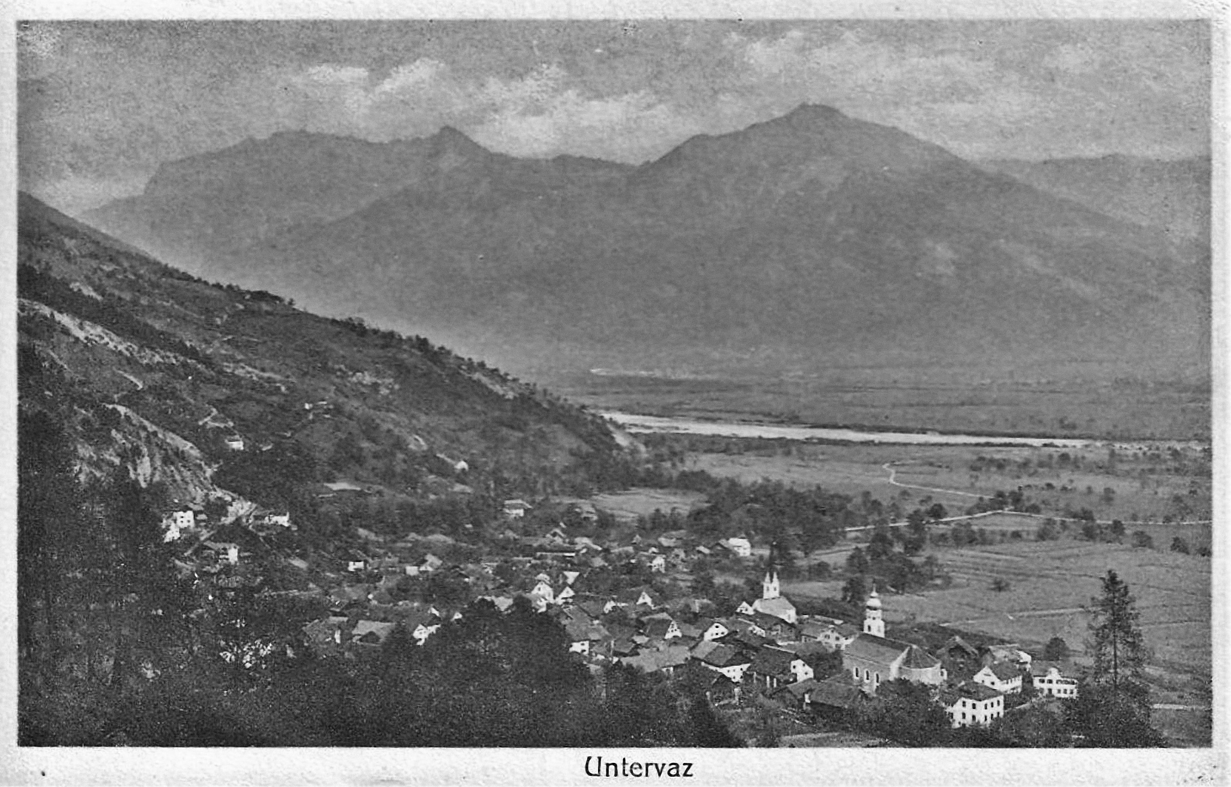 Alte Ansichtskarte von Untervaz von 1925/26. Blick vom Fallboden in Richtung Nordosten auf das Dorf. Dahinter die Rheinebene mit dem damals noch teils…