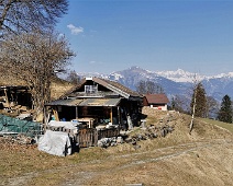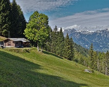 Maiensäss (Haus Nr. 433 auf ca. 1.402 m Höhe) am nördl. Rand von Studaberg. In der rechten Bildhälfte geht der Blick nach Nordosten zu den Bergen des Rätikons…