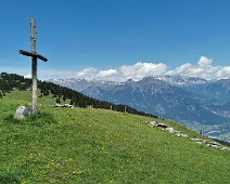 Blick nach Nordosten zum Holzkreuz auf blumenübersähter Bergwiese am Ostrand der Hochebene der Salaz. In der Ferne das wunderschöne Panorama der Berge des…
