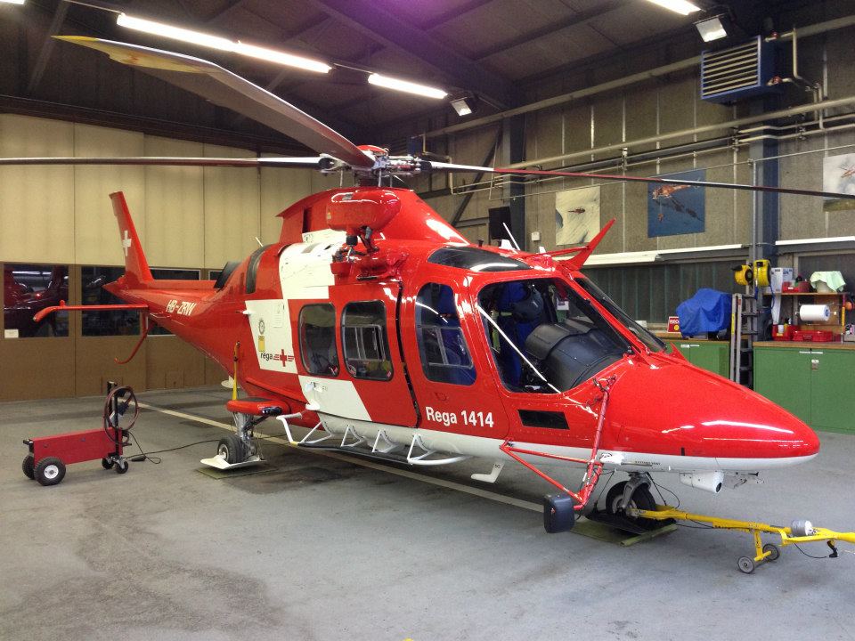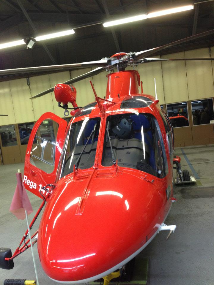 Vorderansicht der "AugustaWestland Da Vinci" der Rega im Hangar des Heliports am Polenlöserweg.