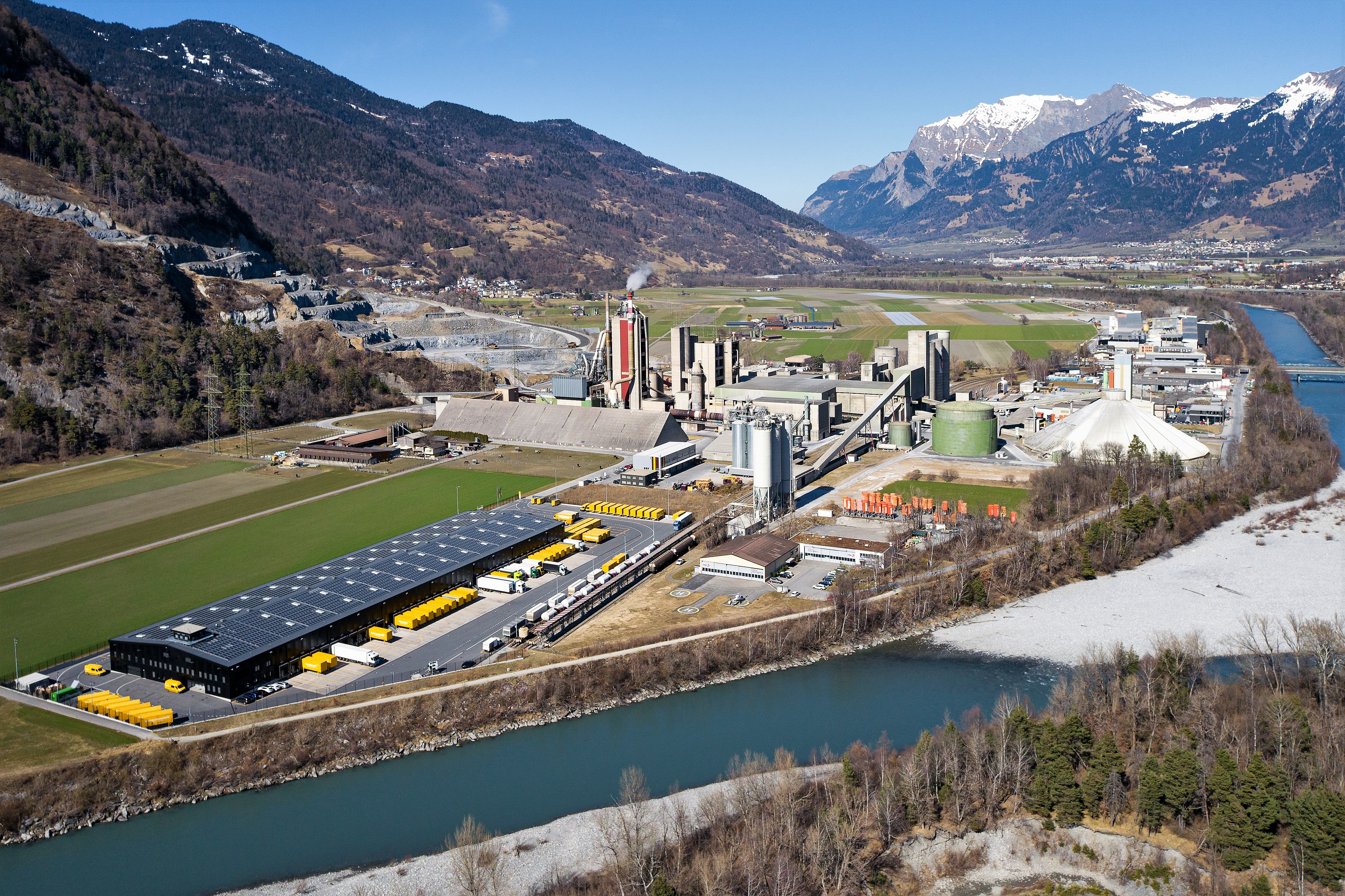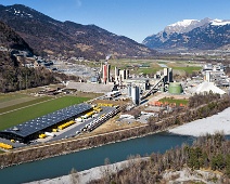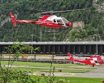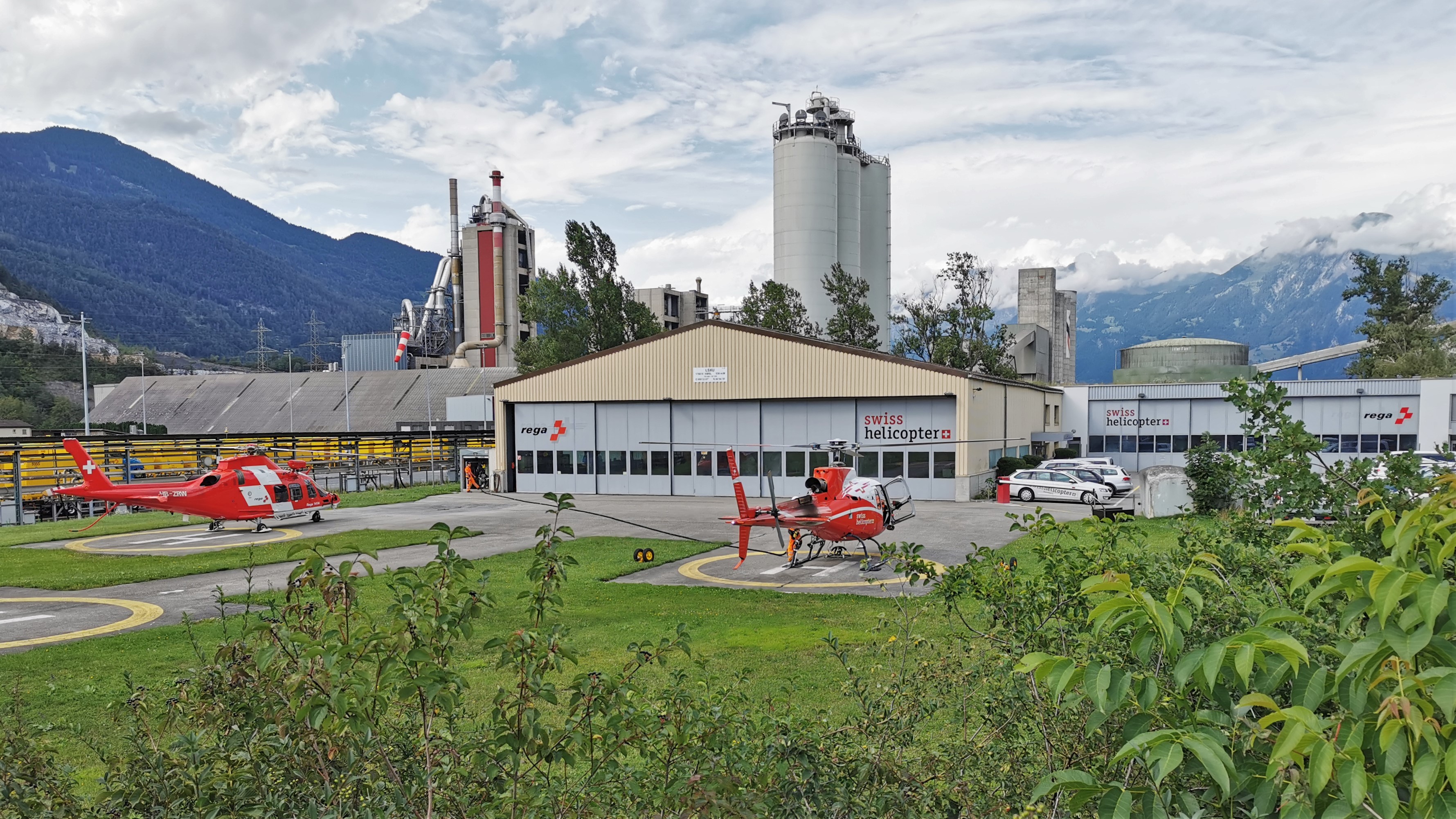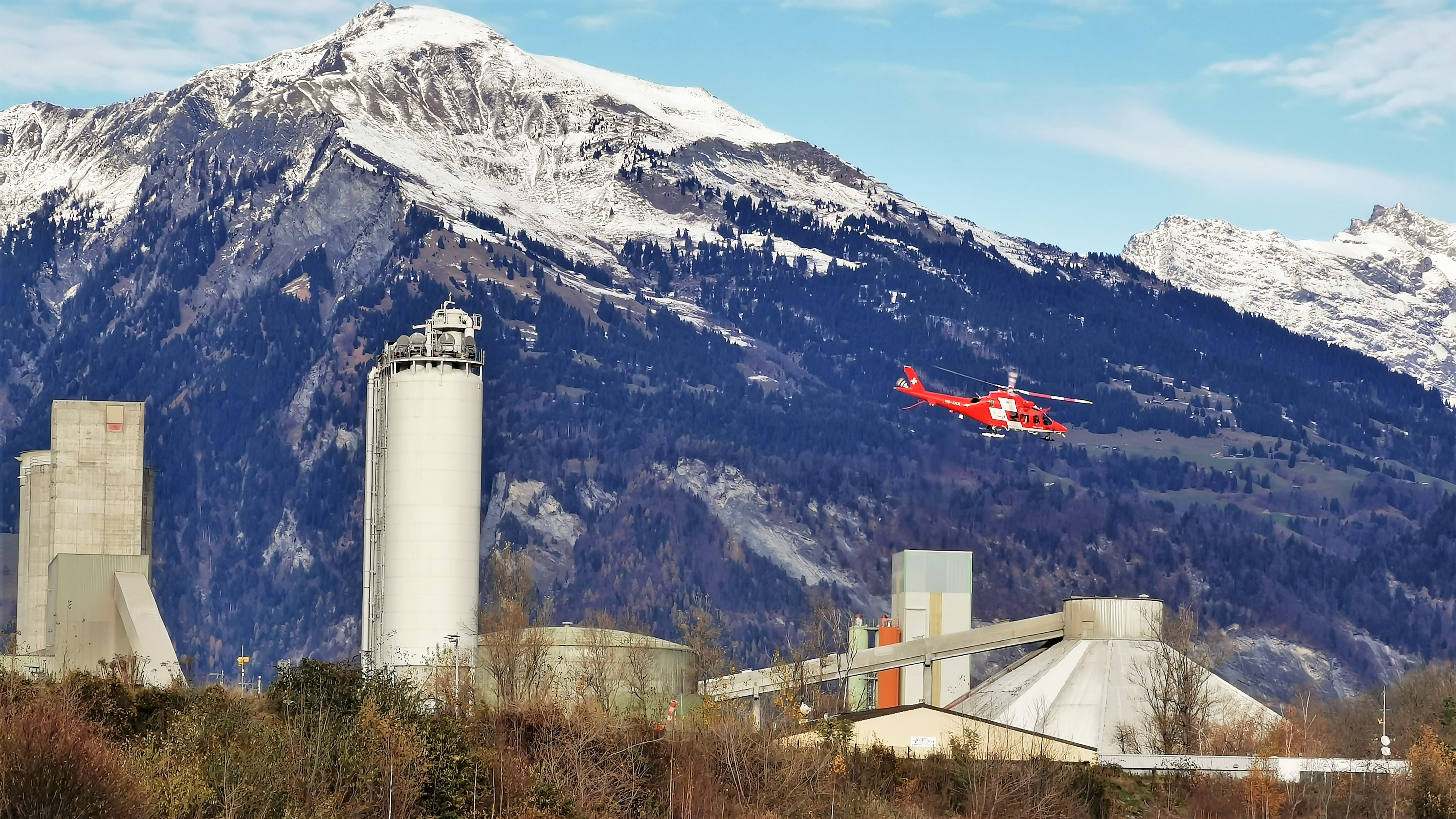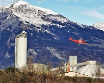 Start der AgustaWestland AW109SP (Rega) vom Heliport (539 m) am Polenlöserweg. Im Hintergrund die Zementsilos des Zementwerkes sowie der Vilan (2.375 m). In der…