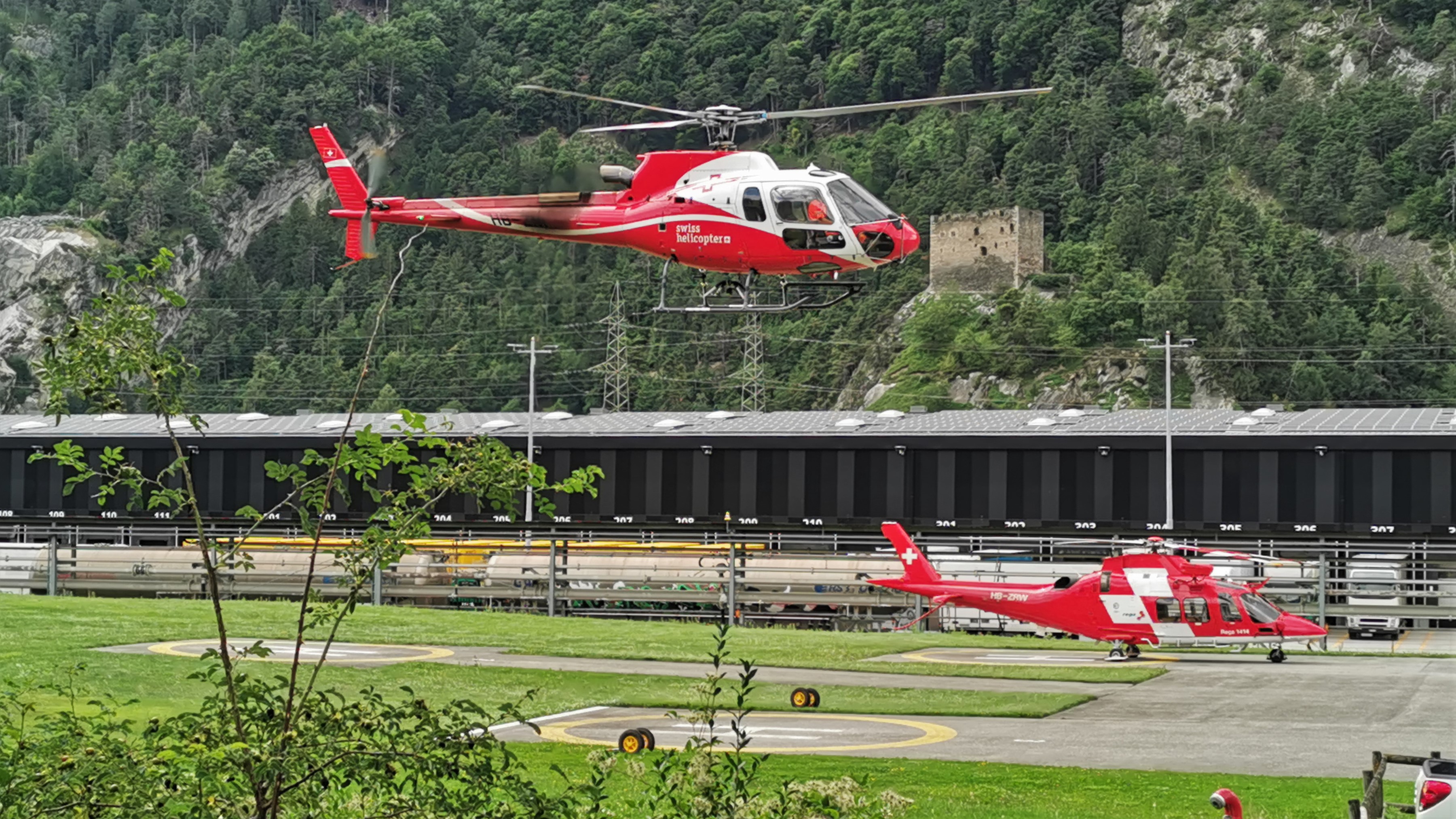 Abheben des "Ecureuil H125 (AS 350 B3)" der Swiss Helicopters vom Heliport. Am Boden der Gebirgshelikopter "AgustaWestland Da Vinci" der Rega. Dahinter die…