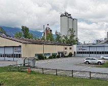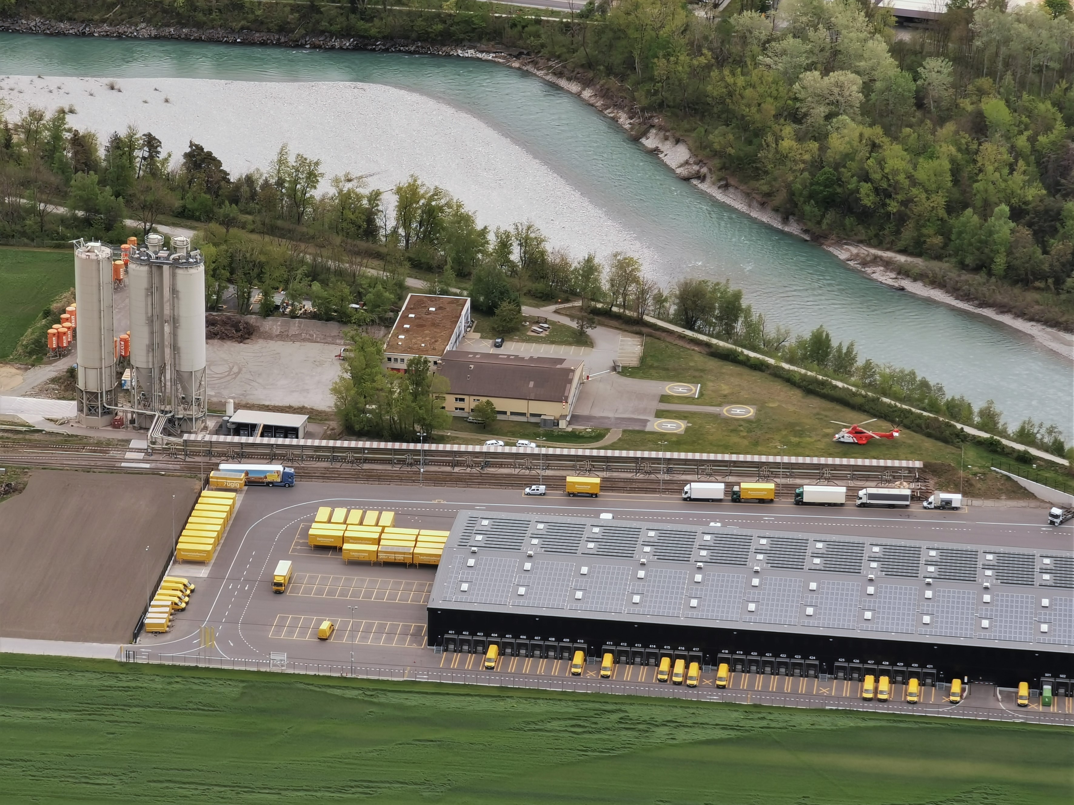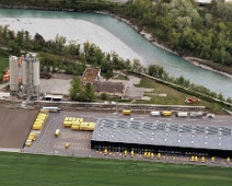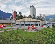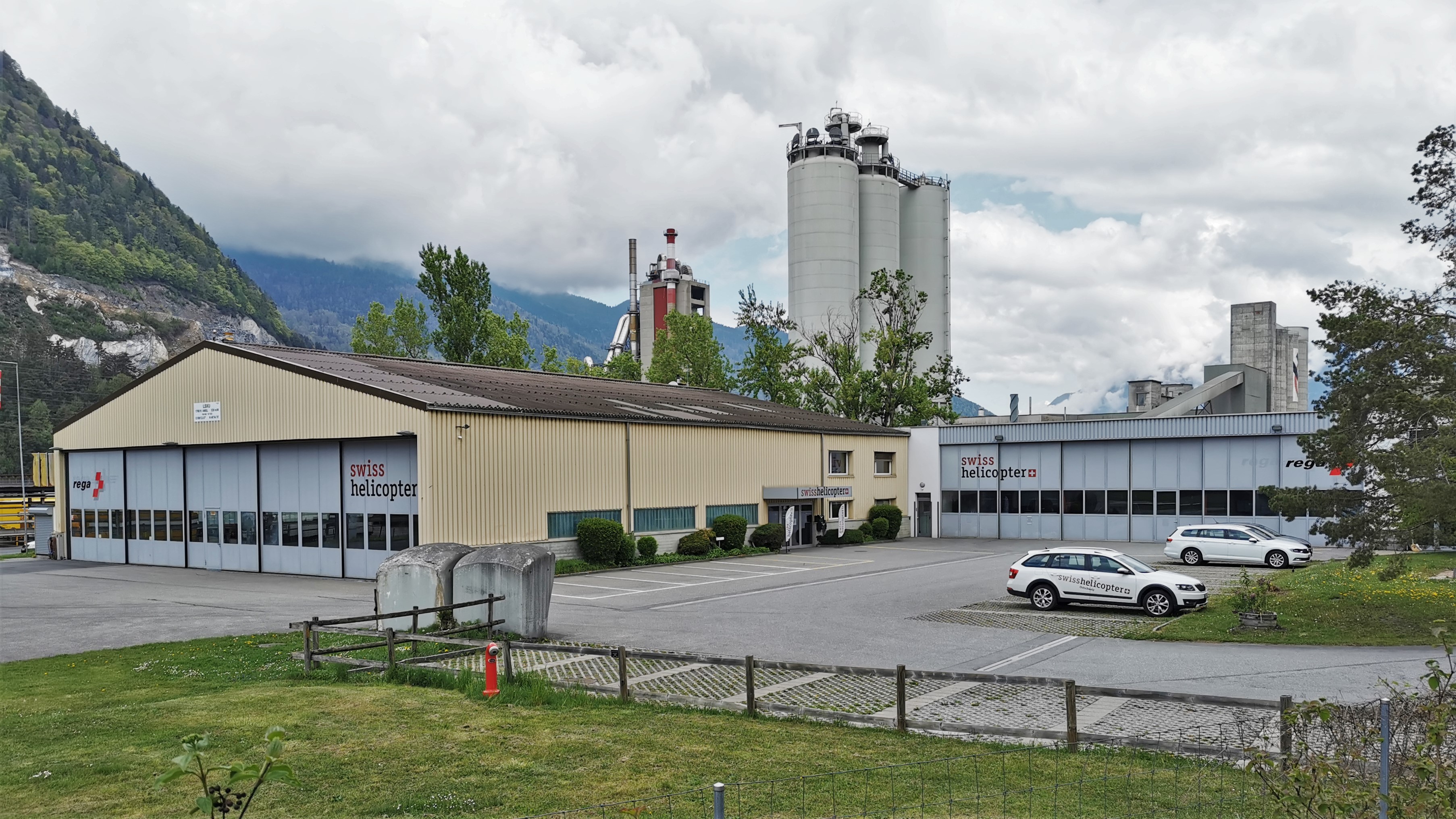 Ansicht von Südosten von Hangar und Verwaltungsgebäude des Heliports am Polenlöserweg. Dahinter Zementsilos des Zementwerkes.