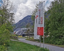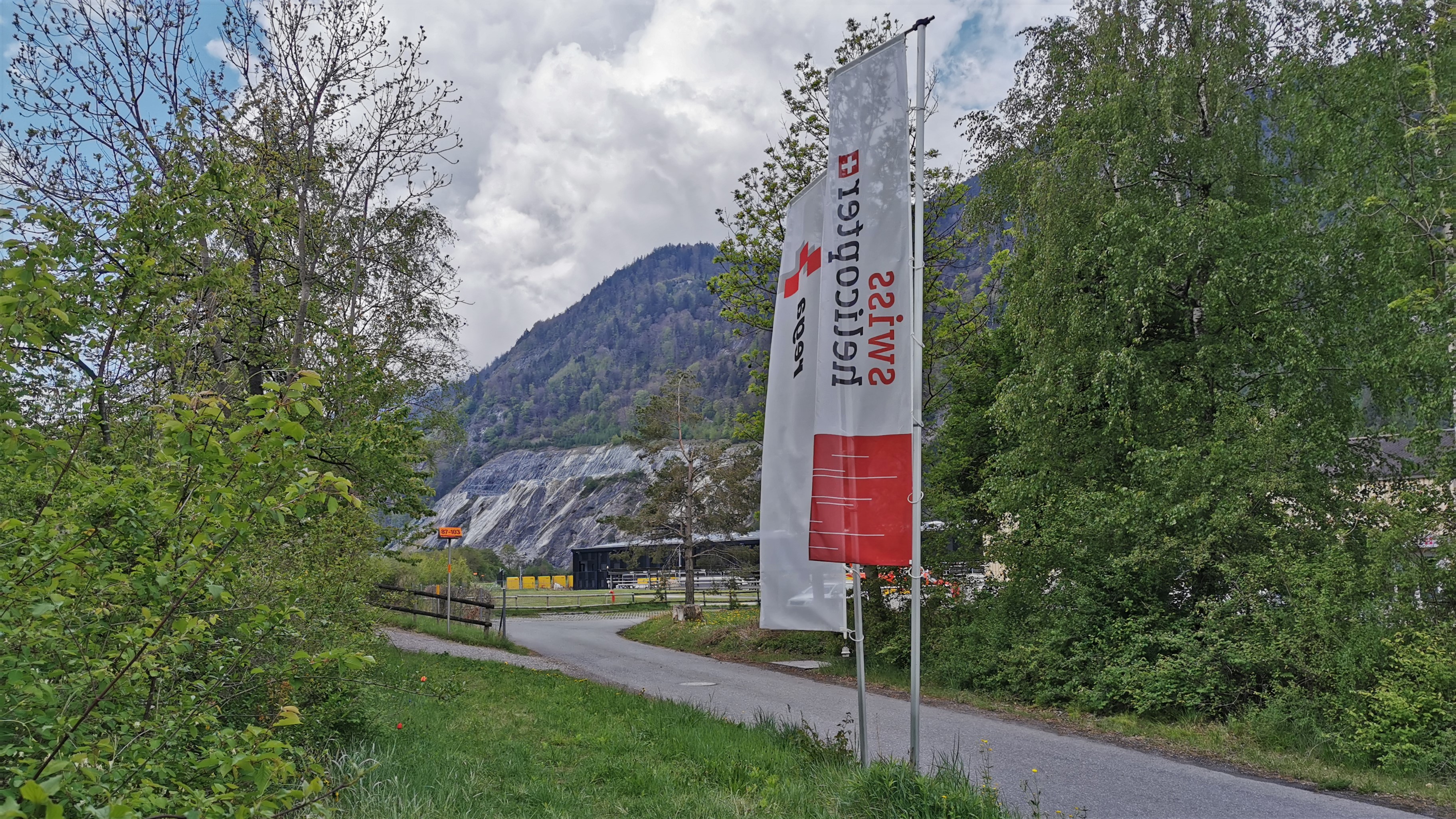 Zufahrt zum Hubschrauberlandeplatz am Ende des Polenlöserweges mit der Firmenbeflaggung von Rega und Swiss Helicopters, die dort eine Einsatzbasis haben.