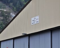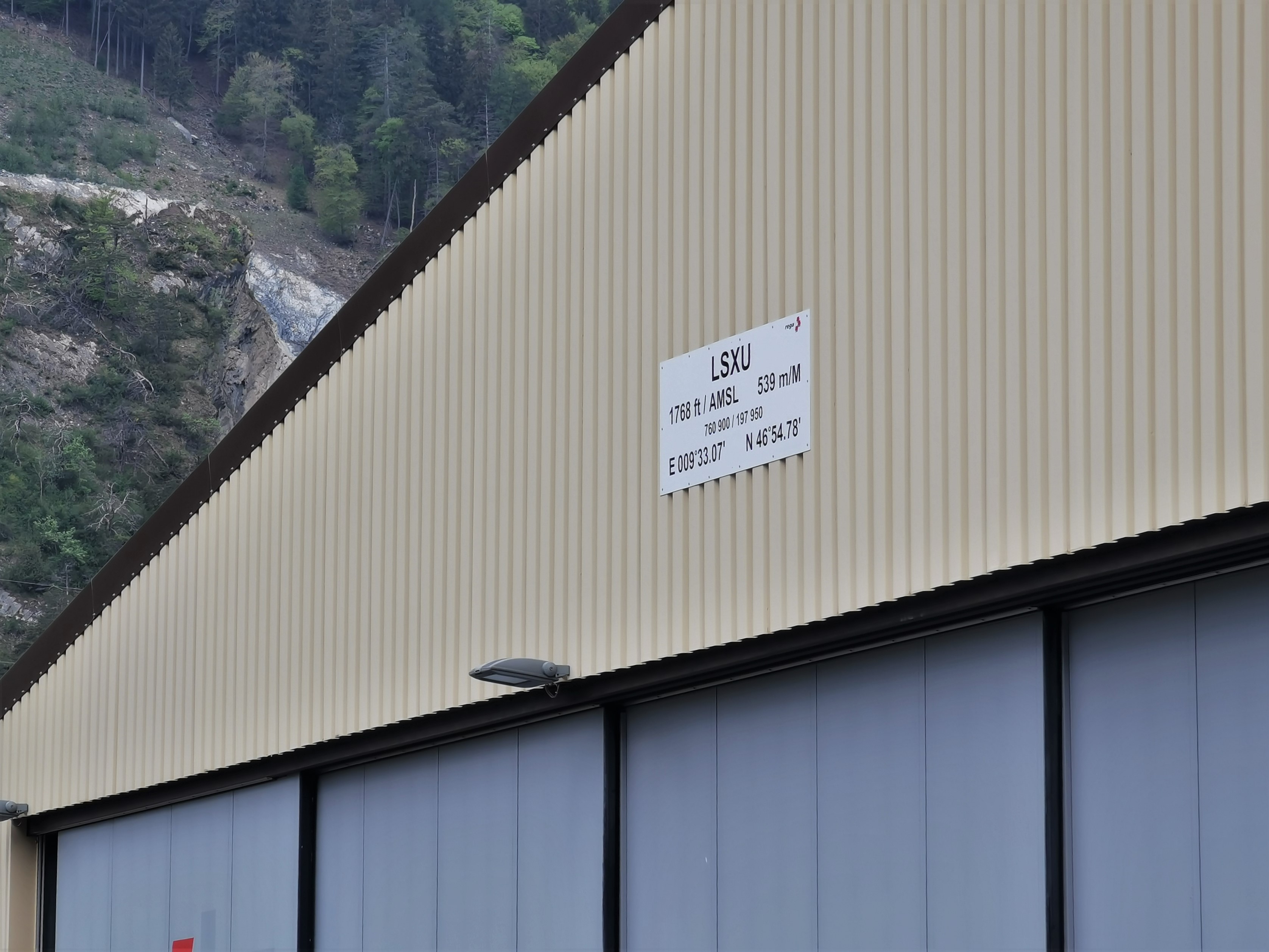 Schild mit Kennung "LSXU" des Landeplatzes am Giebel des Hangars des Heliports am Polenlöserweg ("Heliport Untervaz") sowie den Standort-Koordinaten (in…