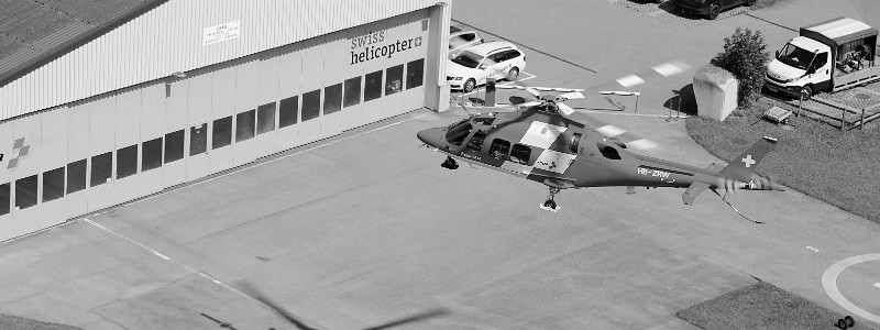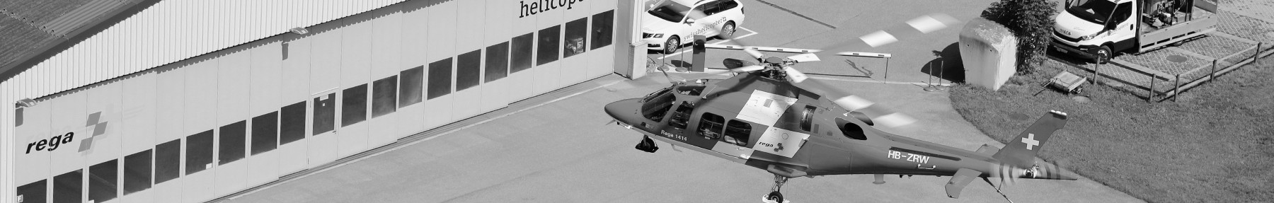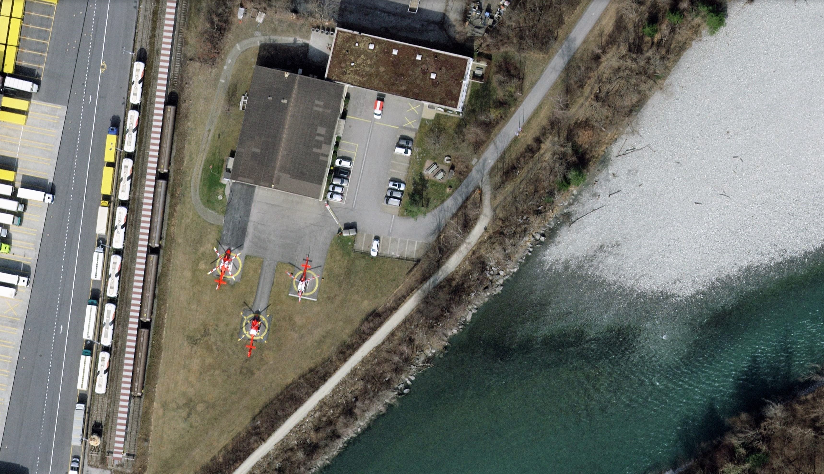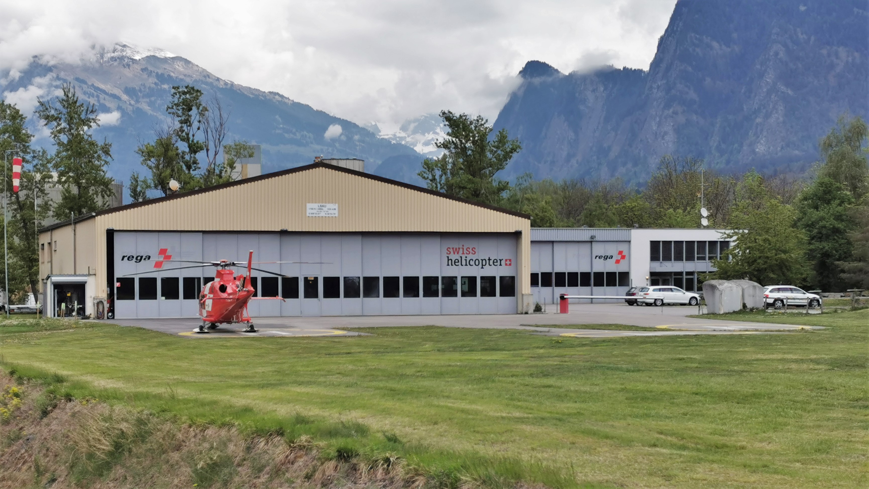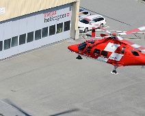 Blick auf Landeplätze und Hangar von Rega und Swiss Helicopters mit Helikoptern der Rega (links - "AgustaWestland Da Vinci") und Swiss Helicopters (rechts -…