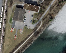 Blick von der Schlosshalda (946 m) nach Osten hinab zum Heli-Landeplatz am Ende des Polenlöserweges (539 m) mit den drei Landepunkten (Pads, "H") und dem Hangar…