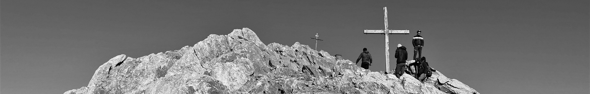 Gipfelkopf des Haldensteiner Calanda (2.805 m) mit beiden Gipfelkreuzen (rechts das neue Gipfelkreuz von 2022), vom Aufstiegsweg von Süden aus gesehen.