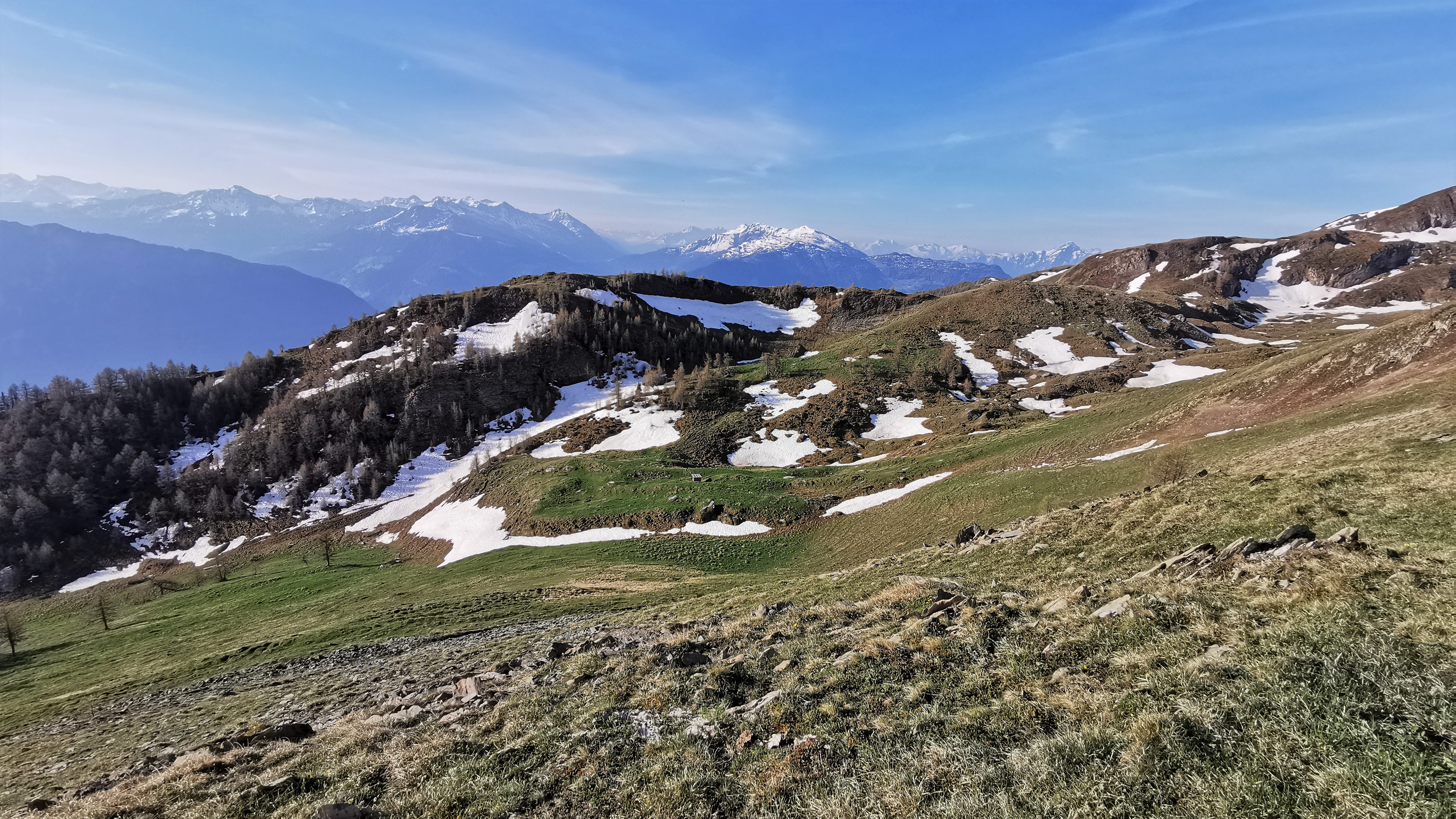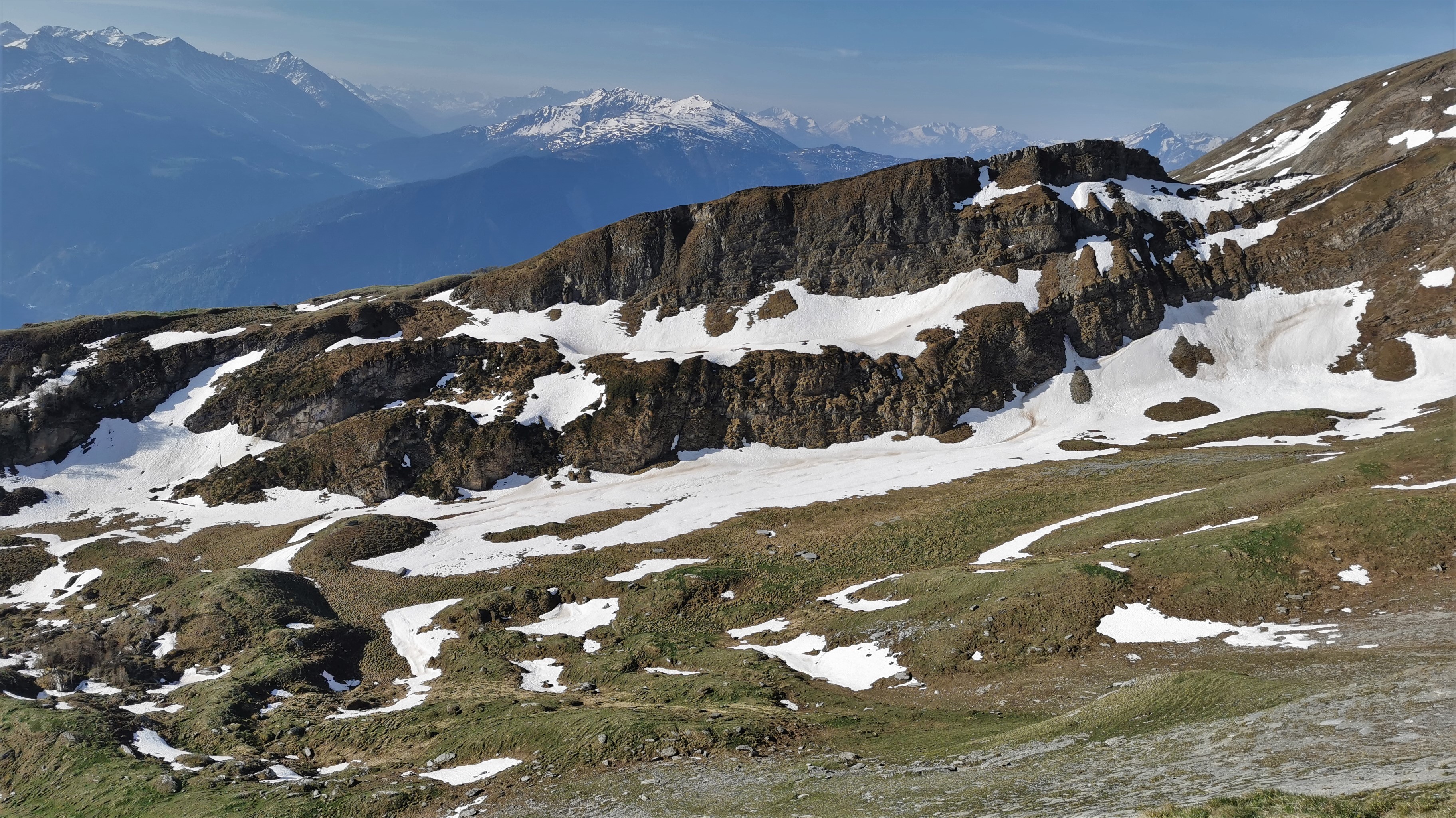 Blick im zeitigen Bergfrühling von der Sunntigweid am Übergang zum Mättneregg (auf ca. 2.014 m Höhe) nach Süden über den Ausgang des Tales, welches von rechts…