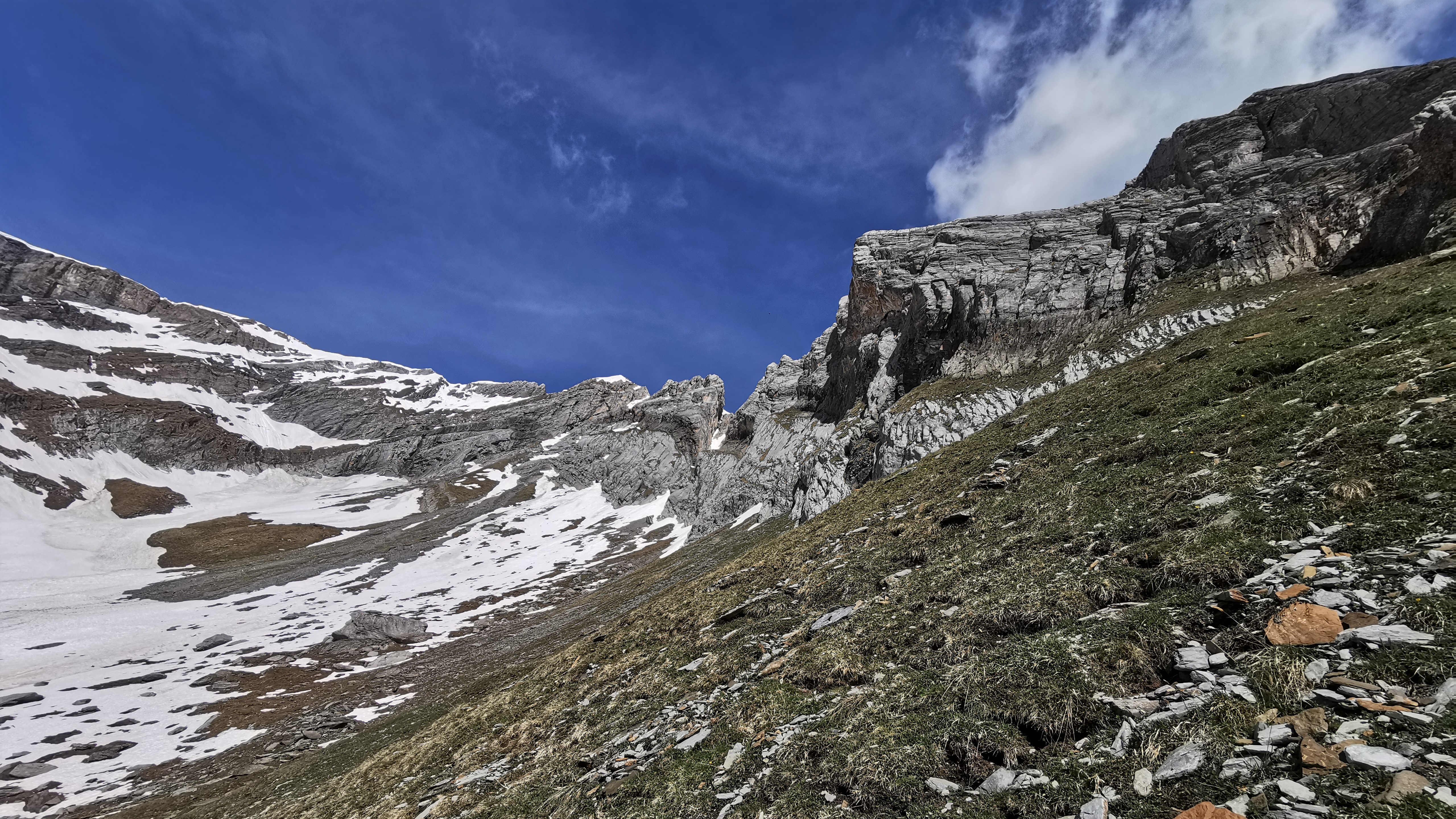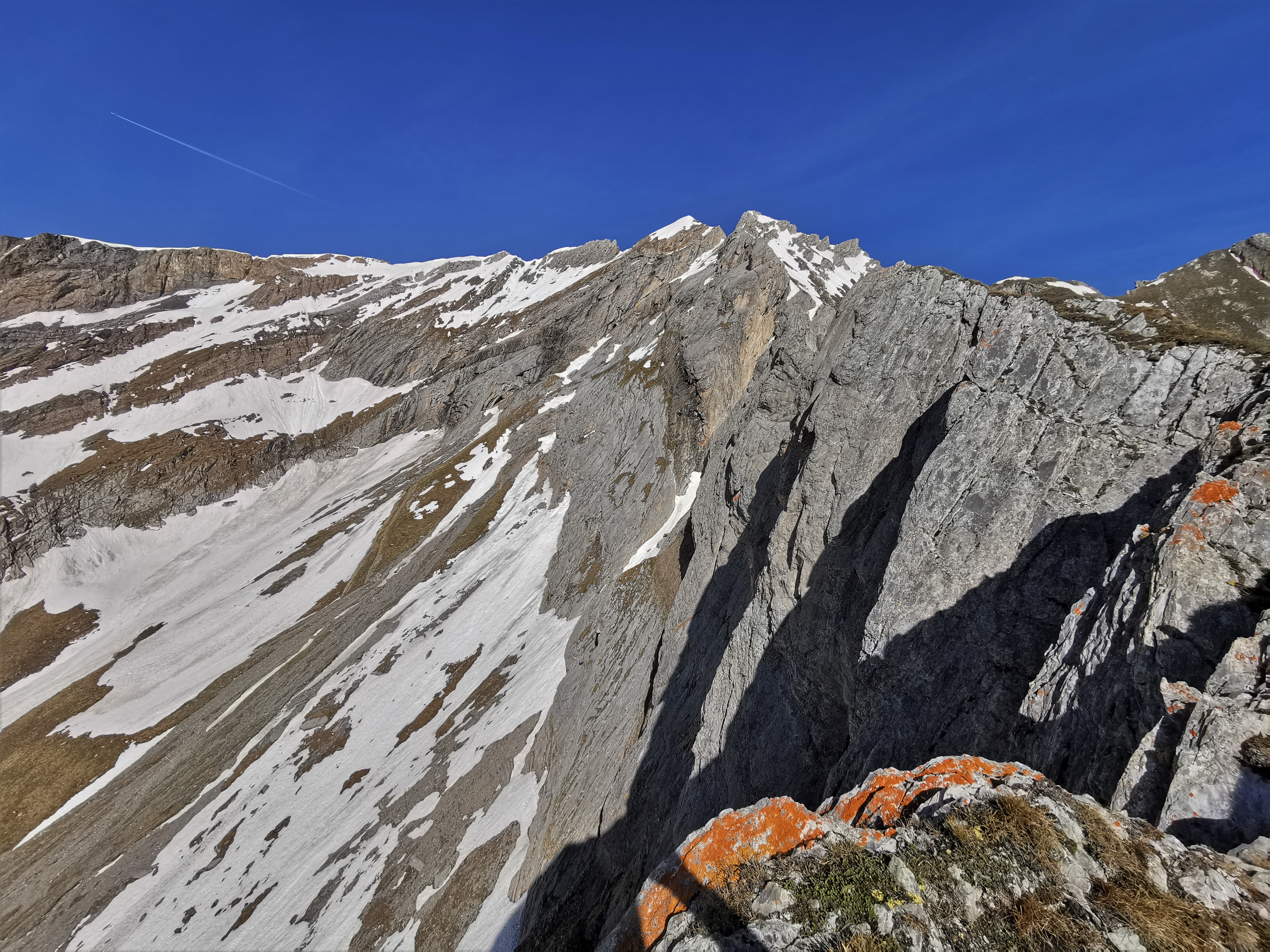 Blick (auf ca. 2.200 m Höhe) nach Westen aus dem Grasschrofen beim Abstieg vom Gamsfürggli (inoffizieller Name) die steilen Felswände an der Südseite des…