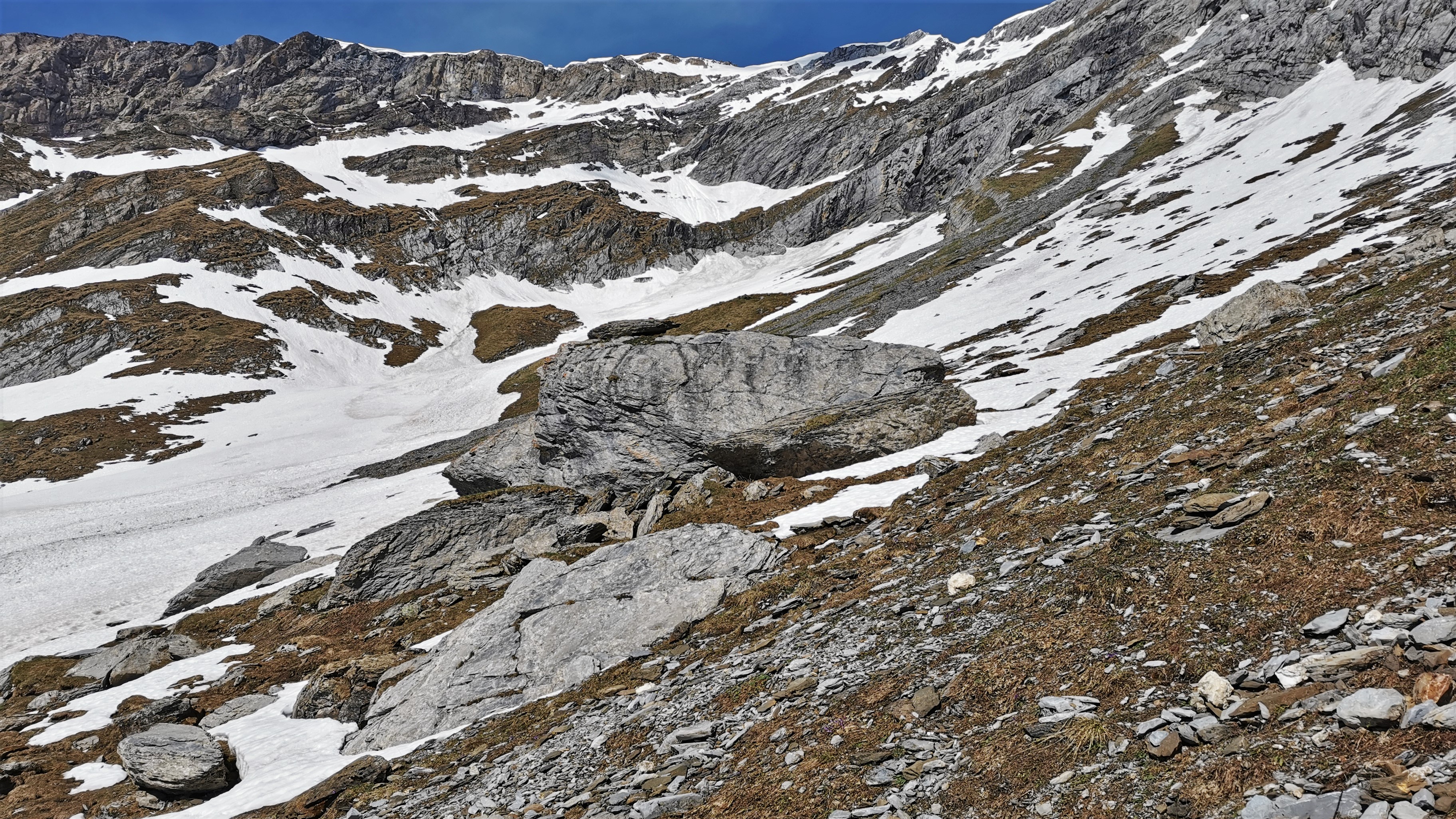 Auf ca. 2.218 m Höhe im nördl. Bereich des Hinter Tals unter den steilen Anhängen des Mättnereggs liegender Felsblock. Blick nach Westen zum Hauptkamm des…