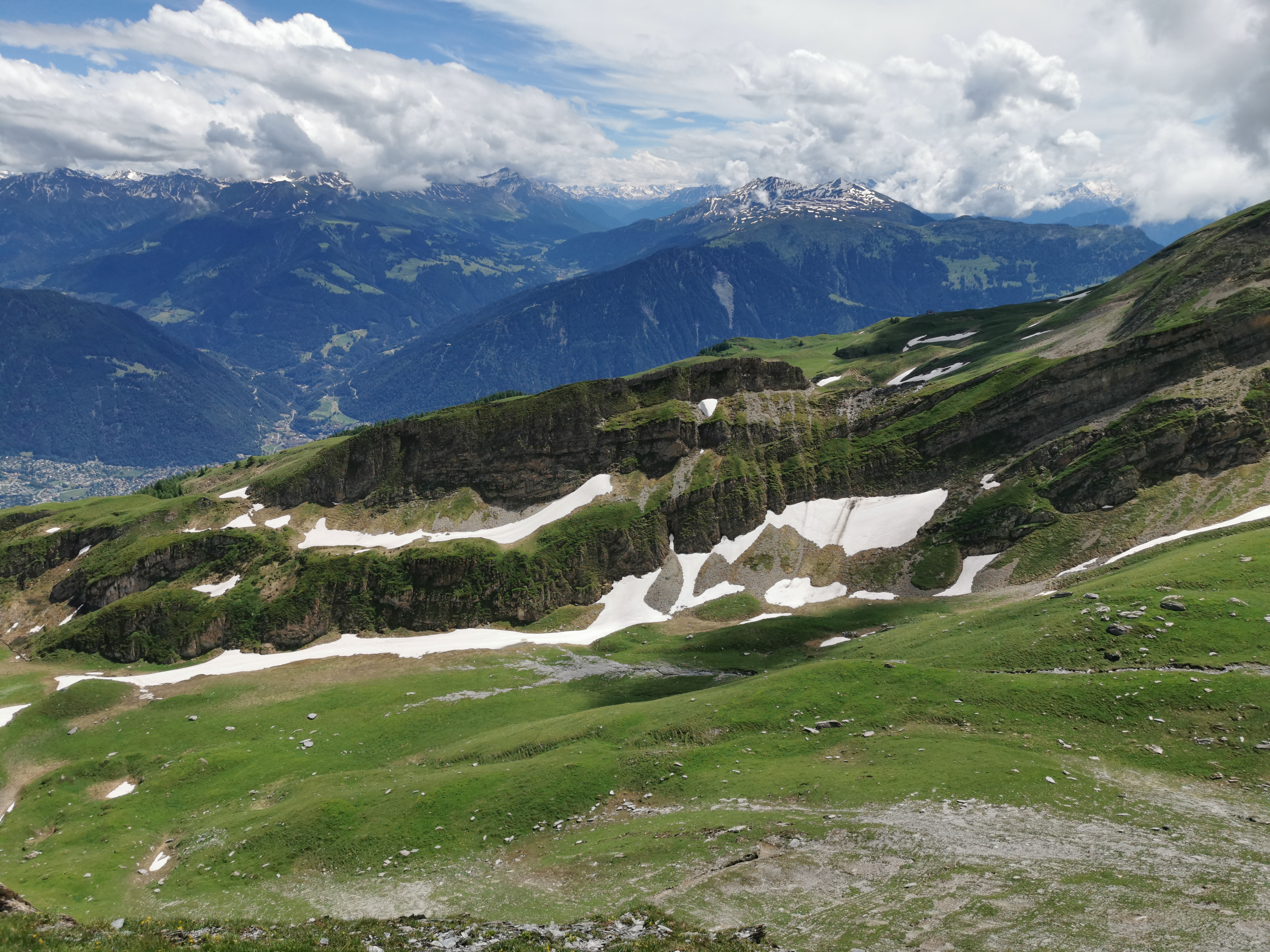 Ausblick von ca. 2.280 m Höhe nach Südosten über das Hinter Tal (Hinder Tal) hinweg bis zum Stätzerhorn (2.574 m) in der Ferne.