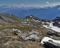 Blick aus dem oberen Bereich des Mättnereggs (auf ca. 2.410 m Höhe) nach Westen zum Calanda-Hauptkamm. Etwas links der Bildmitte oben, die kleine, recht flache…