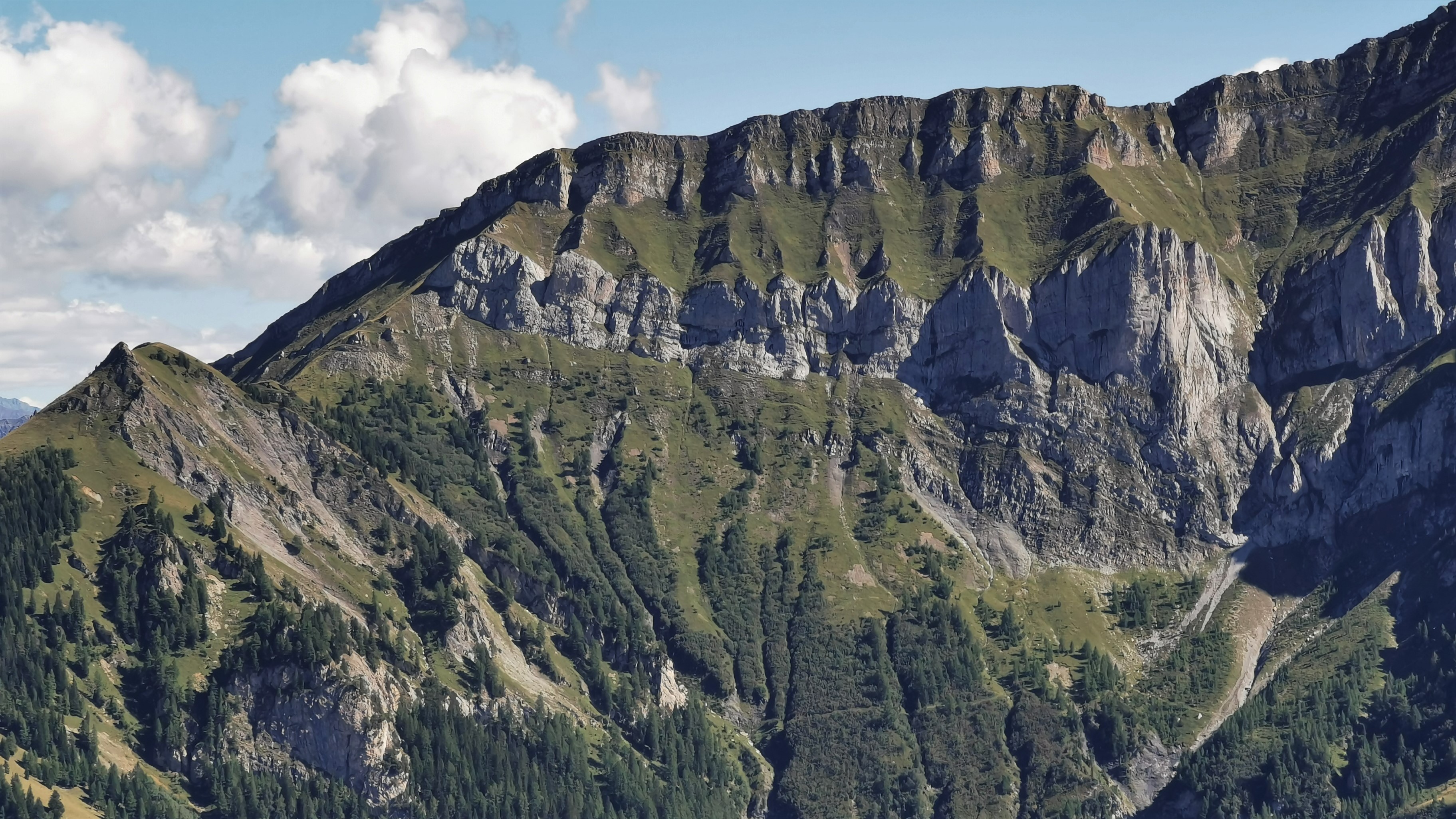 Blick von ca. 2.016 m Höhe nach Süden auf die Wandfluchten vom Berger Calanda, ganz rechts der kleine Einschnitt im Kamm ist das Calandatörl. Darunter die…