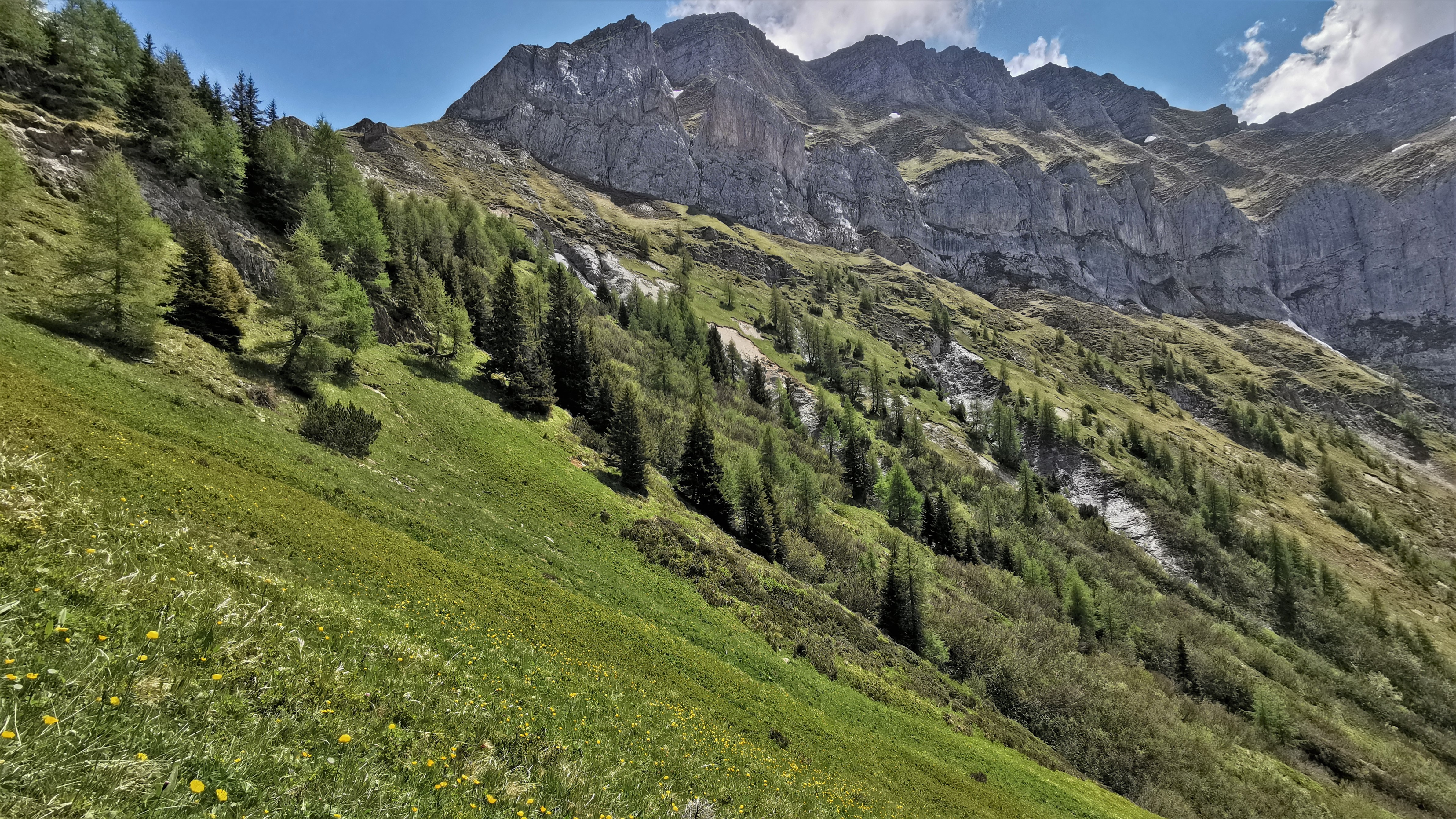 Blick (auf ca. 2.016 m Höhe) eine blühende Bergwiesen als steilen Schrofen hinab in den oberen Abschnitt der Schrötertobels mit seinen zahlreichen Zuläufen.…