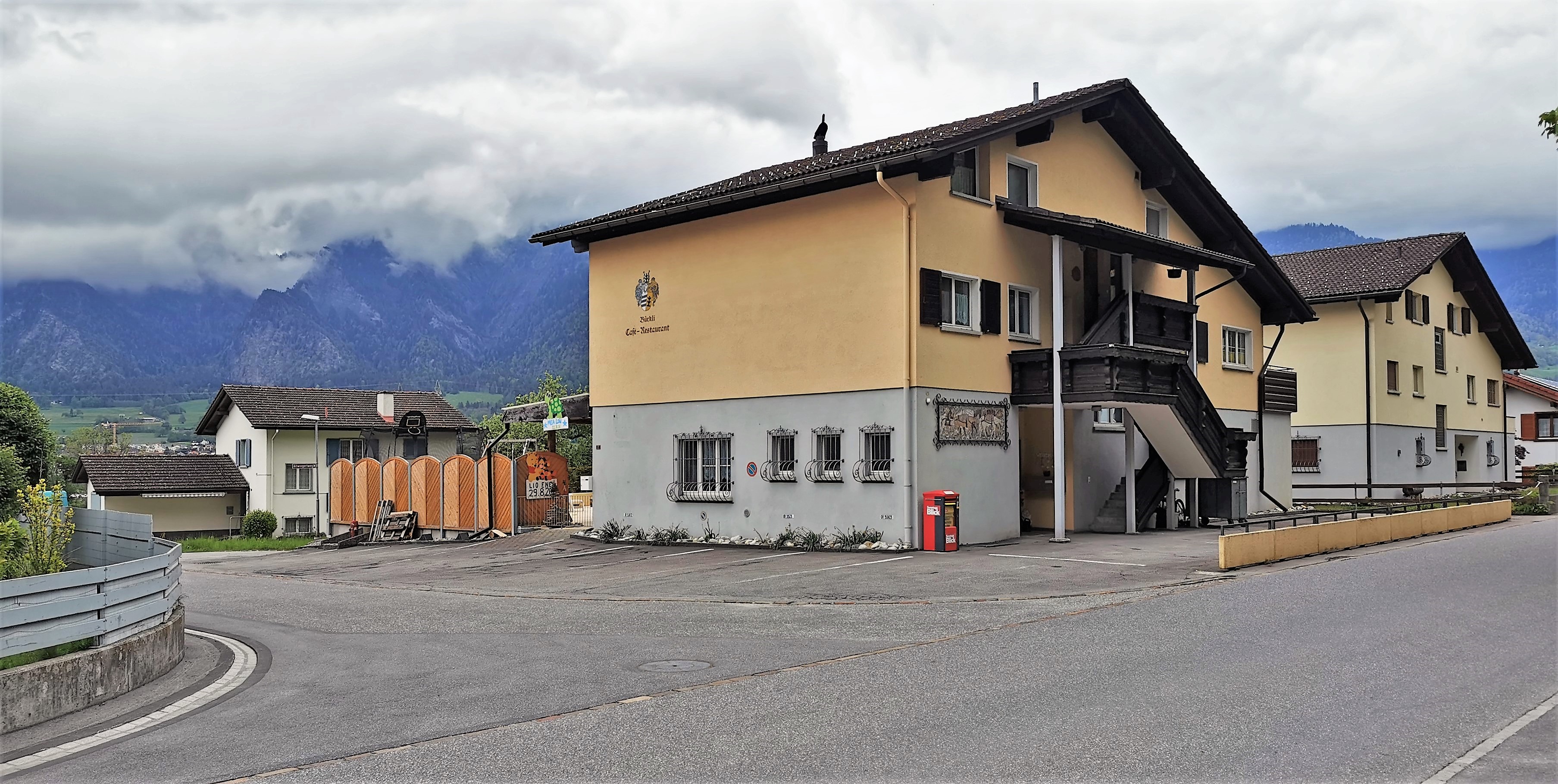 Bogen der Cosenzstrasse an der Einmündung des Fenzaweges. Im Hintergrund die Wohn-Überbauung am Rai-Areal. Blick vom Vorplatz des ehem. Café-Restaurant Bürkli…
