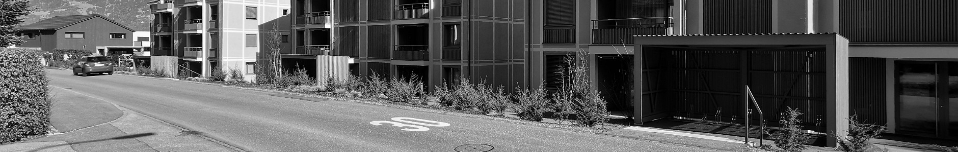 Blick zum nördl. Ende der Cosenzstrasse am Sala-Brüggli (545 m). Links der weisse Neubau Laurentiusweg 6, dahinter das Mehrfamilienhaus Giesacker 1 mit seiner…